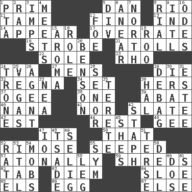 ACROSS 1. Demure 5. One of the 12 tribes of Israel 8. River (Sp.) 11. Not wild 12. A pale, very dry sherry 13. Working for oneself (abbr.) 14. Become visible 17. Make much ado about nothing 19. Disco prop 21. Ringlike coral islands and reefs 22. Flatfish 23. 17th letter of the Greek alphabet 24. Federal power corp. 27. Not women's 29. Pass on 32. Canadian anthropologist Darnell 34. Put into a specified state 36. Possessive pronoun 37. Double curve, resembling the letter S 38. Single 39. Blind as ____ 40. Grandmother 41. Not either 42. Chalkboard 43. Eastern Standard Time (abbr.) 44. Remainder 46. Turn to the right 47. It is 50. Not this but _ 52. Full of chinks, cracks, or crevices 55. Oozed 57. Lacking a tonal center or key 59. Fragments 62. Bar bill 63. South Vietnam president (1954) 64. A type of plum 65. Raised railways 66. Ovum 67. Otherwise DOWN 1. Parent Teacher Association (abbr.) 2. Strike 3. Naughty children 4. Confronts 5. HTML Container Element 6. Approach 7. _ pole 8. Monetary unit of Yemen 9. International (abbr.) 10. Lyric poems 12. Enemy 15. Scent 16. Hero or heavy, e.g. 18. Friend of Pooh 20. Gillaume's butler role 24. Marketplace scale 25. Viva Las _ 26. Rep 28. Sir (Sp.) 29. Debunk (Brit. slang) 30. Feeling or showing extreme anger 31. First name in cosmetics 33. Teachers' org. 35. Cigar-shaped 36. Actor Linden 42. Staphylococcus 45. "______ My Girl" (Turtles hit) 47. Electrically charged atom 48. Sadhe (variant) 49. Major League Baseball Commissioner Bud 51. Laconic 52. Pace 53. Slanted text style (abbr.) 54. Disorderly crowds 55. Symbol (abbr.) 56. Small valley 58. Part of a journey 60. Two (Sp.) 61. Perceive with the eye