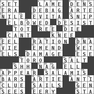 ACROSS 1. Arrange properly for use 4. Unable to walk 8. Lairs 12. Epoch 13. Debunk (Brit. slang) 14. Johnson of "Laugh-In" 15. "Death on the ____" 17. Webber/Rice musical 18. Clip 19. Turned at an angle; bent 21. Stop 23. Small child 24. To sift 26. Pass on 27. Patter 28. Leg joint 30. Snakelike fish 31. Food allowance for one day 34. Heredity factor (abbr.) 37. Compete 38. Make improvements or corrections to 39. Soggy 40. Raised railways 41. Break 42. Compass dir. 43. "Corrida" creature 44. Table seasoning 46. Quiet! 47. Tired old horse 50. Pipe bend 51. Become visible 54. Deli grouping 57. Soap units 58. Nick name for Arthur 60. Opposed to 62. A slight indication 63. Moves on water 64. Commissioned military rank (abbr.) 65. Perceives with the eye 66. Suggestive of the supernatural 67. R.R. building DOWN 1. Elected rep. 2. One of the Great Lakes 3. Baron Munchausen's specialties 4. Prying instrument 5. Remain 6. Floor protector 7. Mild oath 8. Small ungulate mammals of Africa 9. Bert's buddy 10. Nuclear Threat Initiatives 11. Back-to-school mo. 13. Morning condensation 16. Inky black, to poets 20. Baseball player Mel 22. Genesis locale 25. Supplementing with great effort 27. To provide with a ceiling 29. Thickened enlargement 30. First lady 31. Posterior 32. ID or VA city 33. Afternoon social gathering 34. Residences 35. Egg locale 36. Had dinner 41. Capital of the state of Qatar 43. College papers 44. Ocean 45. _ mater 46. Disorder 48. Moving about 49. Lightheartedly 51. Lettered men learn these first 52. Light colored 53. To erase 55. French article 56. Proofreading order 59. Actress Charlotte 61. _ tizzy (2 wds.)