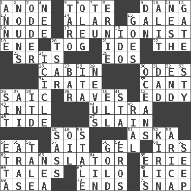 ACROSS 1. At once, immediately (arch.) 5. Lug 9. Mild oath, euphamism for damn 13. Thickened enlargement 14. Having or resembling wings 15. An organ shaped like a helmet 16. Naked 17. One who advocates reunion 19. Compass dir. 20. Coat; cloak 21. Binary compound 22. Definite Article 23. Indian titles of respect 25. Greek goddess of the dawn 26. Small house or cottage 30. Lyric poems 34. Feeling or showing extreme anger 35. Patter 36. Ketch in the Levant 39. All-night dance parties 42. Whirlpool 43. International (abbr.) 44. Extreme 46. Event that recurs at intervals 47. Killed 48. Distress signal 51. "____ silly question..." 54. Erode 57. Small island 58. Set 60. Big collection agency 62. Interpreter 65. 4th largest of the Great Lakes 66. Lies 67. _ and Stitch 68. Louse (plural) 69. Toward the sea 70. Conclusions 71. Fastener DOWN 1. Queen of England 1702-14 2. Parts of speech 3. More peculiar 4. Born 5. Pacific island yam 6. Cassini of fashion 7. The 19th letter of the Greek alphabet 8. Bert's buddy 9. One of the 12 tribes of Israel 10. Set down 11. Delicate 12. Yard entry 15. Leaves 18. Wedding promise 20. Russian ruler of old 24. Ice on the eave 27. Oblong piece of solid material 28. Call ___ day 29. Congenital growth or mark on the skin 30. Seas 31. June honoree 32. Conclusion 33. Filthy place 36. Be seated 37. Black tropical American cuckoo 38. It would 40. Pipe bend 41. R.R. building 45. Monetary unit of Yemen 48. Backtalk 49. Lubricate 50. Lacking originality or spontaneity 52. Japanese brewing company 53. N. Chile seaport 54. Singer James 55. Ancient river in northeast Turkey 56. Falsehood 58. Gilt 59. Greek god of love 61. Ooze 63. Teachers' org. 64. Shallow baking pan 65. Raised railways