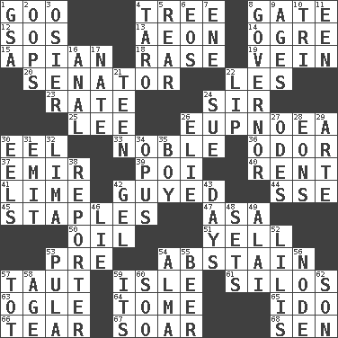 ACROSS 1. Thick or sticky substance 4. Family _ (genealogy) 8. Yard entry 12. Distress signal 13. Age 14. Legendary monster 15. Bee-related 18. Raze (variant) 19. Distinctive style or manner 20. Elected representative 22. French article 23. Pace 24. Title for a knight 25. Area sheltered from the wind 26. Normal relaxed breathing 30. Snakelike fish 33. Having high moral qualities 36. Aroma 37. Independent ruler or chieftain 39. Luau course 40. Monthly bill 41. Welles in "The Third Man" 42. Mocked 44. Compass dir. 45. Paper fasteners 47. White ___ sheet 50. Petroleum 51. Shout 53. Before (prefix) 54. Choose not to consume 57. Strained 59. Small island 61. Grain storage towers 63. Stare 64. Heavy book 65. Wedding promise 66. Rend 67. Fly high 68. Elected rep. DOWN 1. Girls' org. (abbr.) 2. I made a mistake 3. Flexible twig of a willow tree 4. Edible starchy tuberous root 5. Posterior 6. Greek goddess of the dawn 7. Compass dir. 8. Head of state? 9. Ripens 10. Three (prefix) 11. Car or cant ending 16. Of or related to the anus 17. Nathan's nickname 21. Adolescent 22. Mouth edge 24. Take to court 26. Writer Wiesel 27. Lyric poems 28. Immeasurably long periods of time 29. Johnson of "Laugh-In" 30. Snakelike fish 31. Give off 32. Pale green bean 34. Musical composition 35. Male child 38. News announcer 42. Set 43. 24-hour periods 46. Falsehood 48. Arranges properly for use 49. Mountain range southwest of Kyrgyzstan 52. Ms. Damita and namesakes 53. Monetary unit of Botswana 54. _ mater 55. Fermented drink made from hops 56. Connecting point 57. Small child 58. Grow older 59. It is 60. "Barney Miller" actor Jack 62. Male child