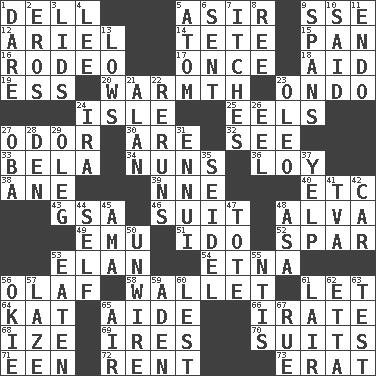 ACROSS 1. Small valley 5. SW Saudi Arabia district 9. Compass dir. 12. Satellite of Uranus 14. False hair 15. Baking dish 16. Cowboy competition 17. Single time 18. Assist 19. Double-curved letter 20. Heat 23. Southwest Nigerian state 24. Small island 25. Snakelike fish 27. Aroma 30. "We ___ not amused" (Victoria) 32. Perceive with the eye 33. Actor Lugosi 34. Religious women 36. Myrna of the movies 38. A saturated hydrocarbon 39. Compass dir. 40. And so on (abbr.) 43. Girls' org. (abbr.) 46. Set of matching outer garments 48. Inventor's middle name 49. Australian flightless bird 51. Wedding promise 52. Coast Guard woman 53. Enthusiasm 54. Inactive volcano in Sicily 56. Norwegian king 58. Place for singles 61. Allow 64. Krazy ___ of comics 65. Helper 66. Feeling or showing extreme anger 68. Ending with capital 69. Angers 70. Sets of matching outer garments 71. Car or cant ending 72. Monthly bill 73. Part of Q.E.F. DOWN 1. Have the gumption 2. Greek god of love 3. Flaplike coverings 4. Area sheltered from the wind 5. Smallest unit of an element 6. Emitted 7. Irritating cutaneous sensations 8. To riddle 9. Connects, as a bridge 10. Alleged 11. Inside; within (prefix) 13. Coldest temperatures 21. Actor Alda or Thicke 22. Summer TV shows 23. Butter sub 24. Retirement account (abbr.) 26. Snakelike fish 27. Chief or king in Benin or Nigeria 28. Lair 29. Cassini of fashion 31. World-weariness 35. Beer mug 37. Sharp bark 41. Federal power corp. 42. 4-wheeled motor vehicle 44. Oneself 45. Nanny (var.) 47. Haul 48. White ___ sheet 50. Undo the wiring of 53. Consumed 55. Nuclear Threat Initiatives 56. Migrant worker of the '30s 57. Goldbrick 59. Arabian gulf 60. For fear that 61. Den 62. Singer James 63. Trial 65. Atmosphere 67. Regret