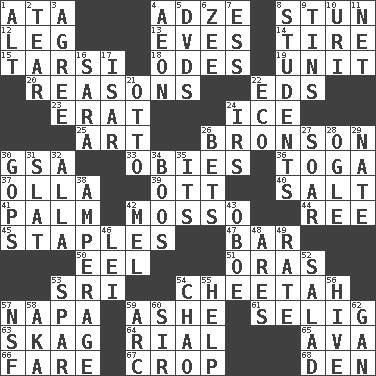 ACROSS 1. _ moment's notice (2 wds.) 4. Axlike tool, used for shaping wood 8. Astound 12. Part of a journey 13. Nights before holidays 14. Become fatigued 15. Tarsus (plural) 18. Lyric poems 19. A single undivided whole 20. Thinks logically 22. Begley and Asner 23. Part of Q.E.F. 24. Frozen water 25. Nonscientific branch of learning 26. "Death Wish" actor 30. Girls' org. (abbr.) 33. Off-Broadway awards 36. Ancient Roman robe 37. Spanish pot 39. Baseball player Mel 40. Table seasoning 41. Inside of hand 42. With motion or animation 44. To separate or throw off 45. Paper fasteners 47. Drinking establishment 50. Snakelike fish 51. Mouths or openings 53. _ Lanka 54. Leopard's kin 57. California wine valley 59. American tennis player Robert 61. Former Milwaukee Brewers owner Bud 63. Heroin 64. Monetary unit of Yemen 65. Actress Gardner 66. Conductor's collection 67. Riding implement 68. Lair DOWN 1. The first octave above the treble staff 2. Pull into pieces 3. Match 4. Period of immesurable duration 5. Movie discs 6. Last letter of the English alphabet 7. Double-curved letter 8. SAT takers 9. Metal containers 10. RI univ. 11. Fish or hair follower 16. "Two Mules for Sister ____" 17. Austrian river, tributary to the Danube 21. "Beetle Bailey" pooch 22. Environmental prefix 24. Big collection agency 26. Stakes 27. Fly high 28. Stare at amorously 29. Nathan's nickname 30. Republicans 31. Narrow board 32. Silent film actress Nazimova 34. Scornful sounds 35. It is 38. Electrical Measurement 42. Cartoonist voice _ Blanc 43. Mitch Miller's instrument 46. Flowery wreath 48. Ancient Greek god of war 49. Assign a rank or rating to 52. First course 53. Practice fight 54. US Secretary of Labor Elaine L. _ 55. Assist 56. Hub of activity 57. Overdraft (abbr.) 58. Alias (abbr.) 59. Curve 60. Title for a knight 62. Separate the seeds from cotton