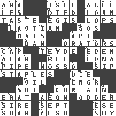 ACROSS 1. Santa ___, CA 4. Capri or Wight 8. Competent 12. French article 13. Passed on 14. Grant temporary use of 15. Clothes sense 18. The front part of a cuirass 19. Chops off 20. Of or relating to Laos or its people 22. Mayday 23. Floor coverings 24. Fitting 25. One of the 12 tribes of Israel 26. Speakers 30. Head covering 33. Miss Universe 1986, Barbara Palacios _ 36. Genesis locale 37. Having or resembling wings 39. To riddle 40. Pulitzer Prize-winning author Ferber 41. Corncob 42. With motion or animation 44. Small drink 45. Paper fasteners 47. Pass on 50. Petroleum 51. Engineer (abbr.) 53. _ Lanka 54. Window treatment 57. Part of Q.E.F. 59. A really long time 61. More peculiar 63. Father 64. Back-to-school mo. 65. Compass dir. 66. Fly high 67. In addition 68. Like a shrinking violet DOWN 1. The first octave above the treble staff 2. Be tempered by heat 3. Indian state 4. The content of cognition 5. Signal 6. Luau accessory 7. Begley and Asner 8. One to whom something is allotted 9. Expressions of contempt or scorn 10. Infant locale 11. Followers of ems 16. Frog relative 17. Singer James 21. Is not 22. Health resort 24. "We ___ not amused" (Victoria) 26. Lyric poems 27. Likelihood 28. Painter Guido (1575-1642) 29. Fastener 30. Smile enhancers 31. Came down and settled, as after flight 32. Dad 34. Greek god of love 35. Affirmative reply 38. News announcer 42. Cartoonist voice _ Blanc 43. Baltic tributary 46. Cards in a Roman deck? 48. To the inside or interior of 49. Mild oath 52. Amusement-park features 53. "Two Mules for Sister ____" 54. 911 reaches them 55. To (old English) 56. Soft 57. Curvy letter 58. River (Sp.) 59. White ___ sheet 60. Snakelike fish 62. Marina Del _, California