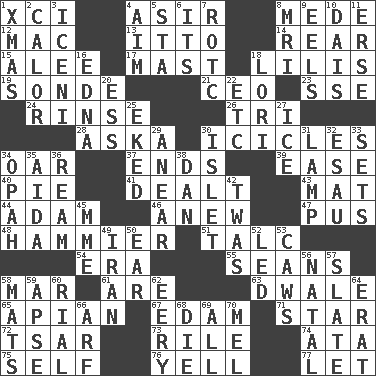 ACROSS 1. One more than ninety 4. SW Saudi Arabia district 8. Ancient Persian 12. Big _ 13. "Tell ____ the Marines!" 14. Bring up, as a child 15. Toward shelter 17. Vertical spar for supporting sails 18. Ms. Damita and namesakes 19. Message 21. Corporate head (abbr.) 23. Compass dir. 24. Remove soap 26. Three (prefix) 28. "____ silly question..." 30. Winter's stalactites 34. Boat paddle 37. Extremities 39. Relaxation 40. Sliced dessert 41. Started a card game 43. Floor covering 44. First man 46. Afresh 47. Ichor 48. More overdramatic by comparison 51. Baby powder 54. Period 55. Seines 58. Third mo. 61. "We ___ not amused" (Victoria) 63. A sleeping potion; an opiate (poet.) 65. Bee-related 67. Dutch treat 71. Play the lead 72. Russian ruler of old 73. Cause heat under the collar 74. "One Day ___ Time" 75. Automatically 76. Shout 77. Allow DOWN 1. Dec. holiday 2. Bodily heat indicating an inflammation 3. Ancient Celtic tribe of eastern Britain 4. Direct toward a target or goal 5. R.R. building 6. It is 7. College mil. group 8. Medical imaging device (abbr.) 9. Snakelike fish 10. Raised platform 11. Celtic language 16. Pulitzer Prize-winning author Ferber 18. Australian parrot (variant) 20. Double-curved letter 22. And so on (abbr.) 25. Made supply last 27. Frozen water 29. Approach 30. Small island 31. Desk light 32. He sold his birthright 33. Arranges properly for use 34. Brightly colored fish 35. Opera by Verdi 36. 480, 500 or 516 sheets of paper 38. One of the 12 tribes of Israel 42. It was, poetically 45. Madame (abbr.) 49. SW Asia republic 50. Ewer handle 52. Directed 53. Crow sounds 56. Relating to or accompanying birth 57. Chalkboard 58. Floor protectors 59. Domed church section 60. Monetary unit of Yemen 62. Suggestive of the supernatural 64. Part of Q.E.F. 66. Sandy's bark 68. Pass on 69. 100% 70. Cartoonist voice _ Blanc