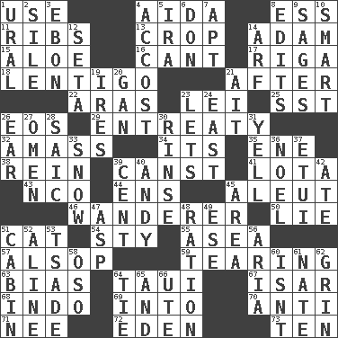 ACROSS 1. Purpose 4. Opera by Verdi 8. Double-curved letter 11. Chest bones 13. Riding implement 14. First man 15. _ vera 16. Patter 17. Port city in Latvia 18. Small, flat, pigmented spot on the skin 21. Following 22. Caspian sea tributary 23. Luau accessory 25. Fast jet (abbr.) 26. Greek goddess of the dawn 29. Plea 32. Collect or gather 34. It is 35. Compass dir. 38. It's straight from the horse's mouth 39. 2nd pers. sing. pres. of can (arch.) 41. Globular water bottle used in Asia 43. Non-commissioned officer (abbr.) 44. Followers of ems 45. Native American of Southwest Alaska 46. Nomad 50. Falsehood 51. Domesticated feline 54. Filthy place 55. Toward the sea 57. Columnist Joseph or Stewart 59. Lacerating 63. Prejudice 64. "Change" in Tahitian 67. Austrian river, tributary to the Danube 68. _ china 69. To the inside or interior of 70. Opposed to 71. Born 72. Genesis locale 73. Nine, plus one DOWN 1. Mountain range 2. Filth; sediment 3. Inky black, to poets 4. Buttonhole 5. Retirement account (abbr.) 6. Spanish title 7. Fitting 8. Prepares for publication 9. Gurus 10. Don Adams' spy role 12. Bristle 14. Sandy's bark 19. Angers 20. Separate the seeds from cotton 21. Small island 23. Allows 24. Compass direction 26. Hearing organ 27. Presage 28. Ketch in the Levant 30. Wash lightly 31. Shout 33. Overwhelm 36. Christmas carol 37. Needle holder 39. Penny 40. Actor Griffith 42. Had dinner 45. Length times width 47. Cleo's killer 48. Food allowance for one day 49. Compass dir. 51. Small house or cottage 52. Place in a line 53. Sadhe (variant) 56. Roberta Peters solo 58. Bear (Spanish) 60. Is not 61. Nathan's nickname 62. Broad smile 64. Neckwear 65. Plus 66. Shoshoni