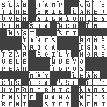 ACROSS 1. Broad, flat, thick piece 5. Pack (down) 9. ____ d'Azur (French Riviera) 13. Hoop that covers a wheel 14. 4th largest of the Great Lakes 15. Member of a famous L.A. basketball team 16. Baking chamber 17. Seigniories (variant) 19. Animal enclosure 20. R.R. building 21. Non-commissioned officer (abbr.) 22. Compass dir. 23. Political cartoonist Thomas 25. Arrange properly for use 26. Receives possession of 30. Play 34. N. Chile seaport 35. Austrian river, tributary to the Danube 36. Czar 39. Turbulent 42. Greater amount 43. Ubangi River tributary 44. New (sp.) 46. Lightbulb-shaped fruit 47. Literary convention 48. Can I? 51. Path through which fluid escapes 54. Music discs 57. Period 58. Compass dir. 60. Mouth edge 62. Below the epidermis 65. Armed conflicts 66. Related on the mother's side 67. Grandmother 68. Nuclear Threat Initiatives 69. Monthly bill 70. Proofreading order 71. Gone DOWN 1. Cease 2. Make or become more lively 3. Sports stadium 4. Benjamin's nick name 5. Trial 6. Operatic vocal solo 7. Russian fighter aircraft 8. Actor Sean's family 9. Auto 10. Migrant worker of the '30s 11. Adolescent 12. Celtic language 15. Spoils 18. Frozen water 20. Play the lead 24. A viewer who gazes fixedly 27. Apertif with cassis 28. Environmental prefix 29. Virtuous person 30. Full of chinks, cracks, or crevices 31. Bear (Spanish) 32. Third mo. 33. Before (prefix) 36. Uncastrated adult male sheep 37. Last letter of the English alphabet 38. According to 40. Nilotic language 41. Slangy assent 45. Grand slam 48. Ancient Persian 49. "We ___ not amused" (Victoria) 50. Tall tales 52. Having winglike extensions 53. Japanese brewing company 54. "Mermaids" star 55. Unit of force 56. Connect, as a bridge 58. Trig term 59. Scram, to a cat 61. Inconspicuous attention getter 63. Baseball player Mel 64. Floor protector 65. Compass dir.
