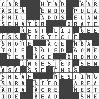 ACROSS 1. Auto 4. Froth on beer 8. Slender fish 11. Toward the sea 13. Inside; within (prefix) 14. Monetary unit of Botswana 15. Silvers or Donahue 16. Sums up 17. Enthusiasm 18. Elected representative 21. Speak pompously 22. Monthly bill 23. Cards in a Roman deck? 25. Turn to the right 26. Curvy letter 29. One of the two male reproductive glands 32. Dinah or Pauly 34. Adept person 35. Basketball assoc. 38. Lacquered or enameled metalware 39. Having a sole or soles 41. Went 43. Nine, plus one 44. Mature 45. U. of Maine site 46. Swallowed 50. Elected rep. 51. White ___ sheet 54. Compass dir. 55. Extremities 57. Bundle of cut stalks of grain 59. Nestling 63. "Two Mules for Sister ____" 64. Passed on 67. Length times width 68. Operatic vocal solo 69. Measure of real estate 70. A home for chicks 71. Binary compound 72. Necklace unit 73. A female animal or person DOWN 1. Smile enhancers 2. American tennis player Robert 3. It's straight from the horse's mouth 4. Centers 5. Conclude 6. Find the sum of 7. Two (Sp.) 8. Russian prison camp 9. Having winglike extensions 10. The wife of a rajah (variant) 12. Having or resembling wings 14. For each 19. False hair 20. Single 21. Petroleum 23. Louse (plural) 24. On the rocks 26. Eastern Standard Time (abbr.) 27. Went for two points 28. Flatfish 30. Stories 31. Engineer (abbr.) 33. Painter Guido (1575-1642) 36. Scornful sounds 37. Queen of England 1702-14 39. Settles 40. Double curve, resembling the letter S 42. A really long time 45. Probability 47. Science/research agcy. 48. Looked after 49. Compass dir. 51. Slender Brazilian palm 52. Pottery fragment 53. Nest on high 56. Comedian Laurel of Laurel & Hardy 58. Auto club (abbr.) 60. Angers 61. Soft 62. Yard entry 64. Small moist lump or mass 65. Frozen water 66. Epoch