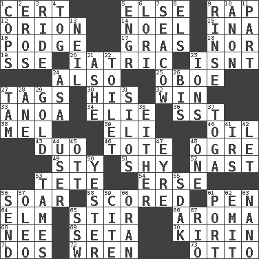 ACROSS 1. Foregone conclusion 5. Otherwise 9. Reproach for some lapse or misdeed 12. Greek mythologigal hunter 14. Christmas carol 15. _ tizzy (2 wds.) 16. Puddle 17. Pate de foie ____ 18. Or not 19. Compass dir. 20. Of or pertaining to medicine 23. Is not 24. In addition 25. Mitch Miller's instrument 27. Labels 30. Part of HMS, perhaps 32. Acquire through effort 33. Small Philippine buffalo 34. Writer Wiesel 36. Fast jet (abbr.) 38. Cartoonist voice _ Blanc 39. Biblical high priest 40. Lubricate 43. Superhero pair 46. Haul 48. Legendary monster 49. Filthy place 51. Like a shrinking violet 52. Political cartoonist Thomas 53. False hair 54. Celtic language 56. Fly high 58. Tallied 61. Writing instrument 64. Shade tree 65. Disorderly outburst 66. Odor 68. Born 69. Bristle 70. Japanese brewing company 71. Two (Sp.) 72. Songbird 73. "Beetle Bailey" pooch DOWN 1. 911 reaches them 2. Greek god of love 3. Travel on an animal 4. Coat; cloak 5. Engineer (abbr.) 6. Australian parrot (variant) 7. Manatee 8. Raised railways 9. Wash lightly 10. At once, immediately (arch.) 11. Component 13. Famous astronaut Armstrong 21. American tennis player Robert 22. Bathroom plumbing fixture 23. Charged atoms 24. White ___ sheet 26. Altar cloth linen 27. Scottish cap 28. A saturated hydrocarbon 29. Aureate 31. Grain storage towers 35. One or the other of two 37. Ancient Roman robe 41. Big collection agency 42. Allow 44. One who makes use of a thing 45. Baseball player Mel 47. Jane of fiction 48. Single 50. Of or pertaining to yesterday 53. Corrects by punishment or discipline 55. Neighbor of Neb. 56. Post 57. Margarine 59. Quote 60. Northwest Algerian city 61. Sweet dark-red dessert wine 62. Give off 63. Billionth: prefix 65. Compass dir. 67. River (Sp.)