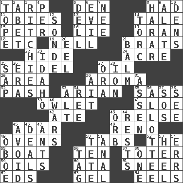 ACROSS 1. Canvas cover 5. Lair 8. Possessed 11. Off-Broadway awards 13. Night before a holiday 14. Story 15. Stone: prefix 16. Untruth 17. Northwest Algerian city 18. And so on (abbr.) 19. 1994 drama film starring Jodie Foster 21. Naughty children 22. Flintstone garb 24. 43,560 square feet 25. Beer mug 27. Lubricate 29. Type of rug 30. Scent 32. Romantic infatuation 33. Believer in; advocate of (suffix) 35. Backtalk 39. A small or young owl 41. _ gin 42. Had dinner 43. Threatening words 45. The sixth month of the Jewish calendar 48. Western Nevada city 49. Baking chambers 50. Bar bills 52. Definite Article 55. Water vessel 56. "___ Little Indians" 57. Carrier 59. Petroleums 60. _ moment's notice (2 wds.) 61. Contemptuous expression 62. Begley and Asner 63. Set 64. Snakelike fish DOWN 1. Drink excessively 2. Collude with 3. Actors Guy, Robert Welles, and Clint 4. For each 5. Small valley 6. Morally bad or wrong 7. Born 8. Ethiopian city, capital of Harari 9. Having winglike extensions 10. Lairs 12. Message 14. Torque (variant) 20. Snakelike fish 21. Lip ointment 23. Potato state 25. Plant excrement 26. Period 27. Mouth or opening 28. Electrically charged atom 30. Small island 31. NE Netherlands city 33. Keyboard modifier key 34. To separate or throw off 36. One to whom something is allotted 37. Mayday 38. Observe 40. Armed conflicts 43. Globe 44. Musical pauses 45. Prevent from happening 46. Allots cards 47. Pismires 49. Mitch Miller's instrument 50. Wig 51. Of or related to the anus 53. The bottom of a shoe or boot 54. Blunders 56. Label 58. Single