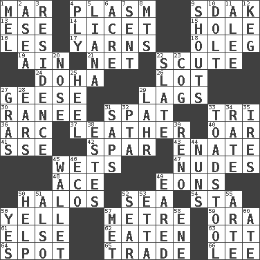 ACROSS 1. Make imperfect 4. Suffix with ecto or cyto 9. Neighbor of Neb. 13. Compass dir. 14. It is permitted: Lat. 15. Hollow 16. French article 17. Tall tales 18. Cassini of fashion 19. The 18th letter of the Arabic alphabet 21. Fish or hair follower 22. Snake scale 24. Capital of the state of Qatar 26. Car dealer's back yard 27. Honkers 29. Falls behind 30. Indian princess (variant) 31. Petty quarrel 33. Three (prefix) 36. Curve 37. Cordwainer's material 40. Rowing implement 41. Compass dir. 42. Practice fight 43. Maternal 45. Moistens 47. Unclothed pictures 48. Adept person 49. Immeasurably long periods of time 50. Auras 52. Ocean 54. R.R. building 56. Shout 57. Distance measurement (Brit.) 59. Mouth or opening 61. Otherwise 62. Ingested 63. Baseball player Mel 64. Specific locale 65. Buy and sell 66. Area sheltered from the wind DOWN 1. Cartoonist voice _ Blanc 2. Toward the sea 3. Dwelling 4. Apply oneself diligently 5. Climbing, woody, usually tropical vines 6. 43,560 square feet 7. Transmitted 8. Mountains (abbr.) 9. Yells 10. Dunce 11. Toward shelter 12. Cask 20. Sense of smell 22. Chalkboard 23. Gear tooth 25. Person who is morally reprehensible 27. Pate de foie ____ 28. Hearing organs 29. Cowardly lion portrayer 31. Plant excrements 32. Parent Teacher Assoc. 33. Inedible or poisonous agaric 34. Assign a rank or rating to 35. Angers 38. _____ Park, CO 39. Former U.S. Attorney General Janet 44. Religious women 45. Place for singles 46. Environmental prefix 49. Having ears or earlike features 50. Aid 51. In addition 52. Scorch 53. Singer James 55. Johnson of "Laugh-In" 56. It is so 57. Was introduced to 58. Compass dir. 60. Had dinner