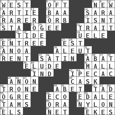 ACROSS 1. Compass direction 5. Often (poetically) 8. ___ Haven, CT 11. Nick name for Arthur 13. Sound made by sheep 14. "Two Mules for Sister ____" 15. More valued for its uncommonness 16. Globe 17. Is not 18. R.R. building 19. Double curve, resembling the letter S 21. Distinguishing feature 22. Periodic rise and fall of the sea level 24. Ubangi River tributary 25. Main course 27. Eastern Standard Time (abbr.) 29. Small Philippine buffalo 30. Eskimo relative 32. Monthly bill 33. Smooth fabric 35. Blind as ____ 39. Dodge 41. Promenade 42. Indiana (abbr.) 43. Medicinal drug used to evoke vomiting 45. Soon (poet.) 48. Keg 49. Heavy duty weighing machine 50. Collude with 52. Small boy 55. Legendary monster 56. Environmental prefix 57. Peak District village in England 59. Scottish caps 60. Mouth or opening 61. High-strength synthetic material 62. Raised railways 63. Fish or hair follower 64. Makes supply last DOWN 1. Armed conflicts 2. Part of Q.E.F. 3. Ski resort town in Vermont 4. Neckwear 5. Mitch Miller's instrument 6. Conductor's collection 7. Keyboard key 8. Rhinal 9. Bert's buddy 10. Electrical Unit 12. Wear away 14. Male parent of an animal 20. Unit of force equal to gravity 21. Ballerina skirt 23. Feeling or showing extreme anger 25. Hearing organ 26. Compass dir. 27. Biblical high priest 28. Elected rep. 30. Had dinner 31. Softens 33. Player for Phoenix 34. Find the sum of 36. Sass 37. According to 38. Affectionate concern, for short 40. Actor's bit 43. Frozen water 44. Eucharist need 45. Therefore, facetiously 46. Typical models 47. Singles 49. Carry 50. Measure of real estate 51. Water vessel 53. Medicinal plant 54. Cub Scout units 56. Age 58. Color