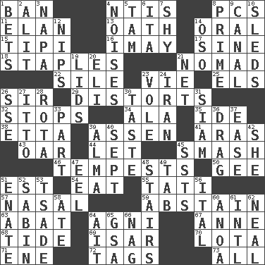 ACROSS 1. Forbid 4. Nuclear Threat Initiatives 8. Personal Computers (abbr.) 11. Style 13. Pledge 14. Relating to the mouth 15. Native american tent (variation) 16. "If ____ say so..." 17. Trig term 18. Paper fasteners 21. Roamer 22. Drop; flow; fall 23. Compete 25. Raised railways 26. Title for a knight 29. What propaganda does 32. Halts 34. Insect wing 35. Binary compound 38. Singer James 39. NE Netherlands city 41. Ancient river in northeast Turkey 43. Boat paddle 44. Allow 45. Box-office sellout 46. Storms 50. Unit of force equal to gravity 51. Eastern Standard Time (abbr.) 54. Ingest 55. Jacques of French films 57. Relating to the nose 59. Choose not to consume 63. Blind as ____ 64. Hindu god of fire 67. Queen of England 1702-14 68. Event that recurs at intervals 69. Austrian river, tributary to the Danube 70. Globular water bottle used in Asia 71. Compass dir. 72. Labels 73. 100% DOWN 1. Stakes 2. Came down and settled, as after flight 3. California wine valley 4. Annoying sounds 5. Scottish cap 6. Call ___ day 7. Like a shrinking violet 8. A-one 9. Lessep's creation 10. Bobsleighs 12. Pinches, bites 14. Bear (Spanish) 19. Flaplike coverings 20. Biblical high priest 21. Fish or hair follower 23. Grand slam 24. SW Asia republic 26. Compass dir. 27. "Tell ____ the Marines!" 28. Roll call or roster of names 30. Clothes sense 31. Thailand, formerly 33. Piece 36. To be drawn or hauled along 37. Comfort 39. _ mater 40. Back-to-school mo. 42. A female animal or person 45. Fast planes 47. Snakelike fish 48. Flight of steps 49. Keyboard key 51. Maternal 52. Unit of acoustic absorption 53. Sadhe (variant) 56. Slanted text style (abbr.) 58. Had dinner 60. Small Philippine buffalo 61. International (abbr.) 62. Anneal 64. Small island 65. Girls' org. (abbr.) 66. Tired old horse