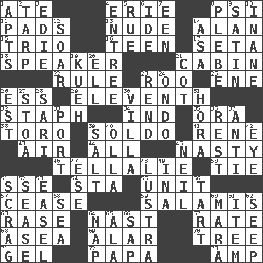 ACROSS 1. Had dinner 4. 4th largest of the Great Lakes 8. Air pressure measure (abbr.) 11. Writing tablets 13. Unadorned 14. ____ Jay Lerner 15. Musical group of three 16. Adolescent 17. Stalk of a moss capsule 18. Orator 21. Small house or cottage 22. Governing power 23. Friend of Pooh 25. Compass dir. 26. Curvy letter 29. Veterans Day date 32. Staphylococcus 34. Working for oneself (abbr.) 35. Mouth or opening 38. "Corrida" creature 39. Twentieth part of a lira 41. French philosopher Descartes 43. Atmosphere 44. Everything 45. Offensive 46. Copy Pinocchio 50. Neckwear 51. Compass dir. 54. R.R. building 55. A single undivided whole 57. Stop 59. Deli grouping 63. Raze (variant) 64. Vertical spar for supporting sails 67. Pace 68. At sea 69. Having or resembling wings 70. Woody plant 71. Set 72. Dad 73. Electrical Unit DOWN 1. Flats, for short 2. Canvas cover 3. Singer Brickell 4. Main course 5. Regret 6. Binary compound 7. Car or cant ending 8. First-year military academy student 9. Smooth fabric 10. Silly 12. Fly high 14. White ___ sheet 19. Malaysian steamed pastry 20. Pipe bend 21. Small bed 23. Tear apart 24. Southwest Nigerian state 26. Eastern Standard Time (abbr.) 27. Portico 28. Indian skirt 30. Country residence 31. Israeli folk dance 33. Sweet dark-red dessert wine 36. State of inaction 37. Against 39. Table seasoning 40. Water jar 42. Sight organ 45. Famous astronaut Armstrong 47. Compass dir. 48. A period of five years 49. _ tizzy (2 wds.) 51. Lean end of the neck 52. Gospel singer Marvin 53. Artist's stand 56. Small pie 58. Ocean 60. Hindu Mythology: god of death 61. Detail 62. Ooze 64. Atlas unit 65. In the manner of 66. Plant excrement