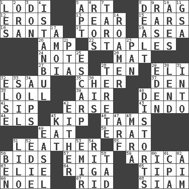 ACROSS 1. Farming town in central California 5. Tate display 8. To draw with force 12. Greek god of love 13. Lightbulb-shaped fruit 15. Hearing organs 16. Before Barbara or Clara 18. "Corrida" creature 19. At sea 20. Electrical Unit 22. Paper fasteners 24. Make mention of 26. Floor covering 27. Prejudice 28. "___ Little Indians" 29. Connecticut Ivy Leaguer 32. He sold his birthright 35. "Mermaids" star 37. Lair 38. Hang loosely or laxly 39. Wind 40. Incision 41. Small drink 42. Celtic language 43. Southeast Asian peninsula 44. Raised railways 45. Sleep 46. Scottish caps 49. Ingest 50. Part of Q.E.F. 51. Cordwainer's material 55. From 56. Auction offers 57. Give off 59. N. Chile seaport 63. Writer Wiesel 64. Port city in Latvia 65. Native american tent (variation) 66. Christmas carol 67. To free from 68. Thailand, formerly DOWN 1. French article 2. Mouth or opening 3. Spanish title 4. Byzantium, centuries later 5. Fitting 6. Vintage cars 7. Small pie 8. Started a card game 9. Raze (variant) 10. Ancient Greek god of war 11. Girls' org. (abbr.) 14. Nomad 17. Mine, in Marseilles 21. Parent Teacher Association (abbr.) 23. Baking dish 25. Fortification 28. Cigar-shaped 29. Genesis locale 30. Grant temporary use of 31. To the inside or interior of 32. Otherwise 33. Earth 34. High mountains 36. Part of HMS, perhaps 40. What propaganda does 42. One or the other 45. Krazy ___ of comics 47. Sandy's bark 48. Hindu Mythology: god of death 49. Artist's stand 51. _ and Stitch 52. Singer Brickell 53. Independent ruler or chieftain 54. Swiss mountan, "Queen of the Mountains" 56. Benjamin's nick name 58. Bit 60. One more than two 61. Accounting whiz (abbr.) 62. Direct toward a target or goal