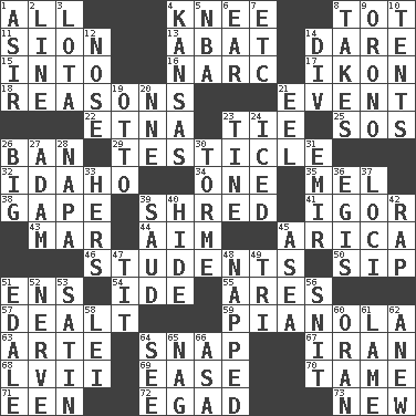 ACROSS 1. Everything 4. Leg joint 8. Small child 11. The Jewish people; Israel 13. Blind as ____ 14. Have the gumption 15. To the inside or interior of 16. Drug cop 17. Picture 18. Thinks logically 21. Happening 22. Inactive volcano in Sicily 23. Neckwear 25. Mayday 26. Bar 29. A testis 32. Potato state 34. Single 35. Cartoonist voice _ Blanc 38. Yawn 39. Tear up 41. Composer Stravinsky 43. Make imperfect 44. Direct toward a target or goal 45. N. Chile seaport 46. SAT takers 50. Small drink 51. Followers of ems 54. Binary compound 55. Ancient Greek god of war 57. Started a card game 59. Player piano 63. Johnson of "Laugh-In" 64. Fastener 67. SW Asia republic 68. 57 in ancient Rome 69. Relaxation 70. Docile 71. Car or cant ending 72. Mild oath 73. ___ Haven, CT DOWN 1. SW Saudi Arabia district 2. Actor's bit 3. Globular water bottle used in Asia 4. Sunflower state 5. Basketball assoc. 6. Hearing organ 7. And so on (abbr.) 8. Proceeds 9. U. of Maine site 10. Portable shelters 12. Olfactory organ 14. HTML Container Element 19. Von Bismarck 20. Compass dir. 21. Snakelike fish 23. Prong on a fork 24. On the rocks 26. Of large size 27. First man 28. California wine valley 30. Singer Mel 31. Arab leader 33. Possessive pronoun 36. The front part of a cuirass 37. Locales 39. Saudi Arabian king (1953-1964) 40. Flintstone garb 42. Strike 45. Toward the sea 47. Teat (slang) 48. Slept 49. Three (prefix) 51. Peak District village in England 52. Boldness 53. Smooth fabric 56. In a ____ (agitated or irritated) 58. Luau accessory 60. NW Algerian seaport 61. Unable to walk 62. Afresh 64. Perceive with the eye 65. Tired old horse 66. White ___ sheet