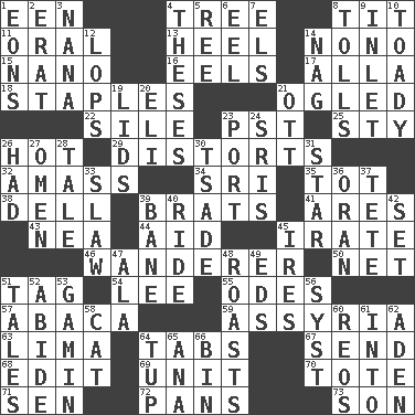 ACROSS 1. Car or cant ending 4. Relationship diagram 8. Teat (slang) 11. Of the mouth 13. The bottom of a shoe or boot 14. Words to Nanette 15. Billionth: prefix 16. Snakelike fish 17. Silent film actress Nazimova 18. Paper fasteners 21. Stared 22. Drop; flow; fall 23. Pacific Standard Time (abbr.) 25. Filthy place 26. Being at a high temperature 29. What propaganda does 32. Collect or gather 34. _ Lanka 35. Small child 38. Small valley 39. Naughty children 41. Ancient Greek god of war 43. Teachers' org. 44. Assist 45. Feeling or showing extreme anger 46. Nomad 50. Fish or hair follower 51. Label 54. Area sheltered from the wind 55. Lyric poems 57. Phillipine bananalike plant 59. Nineveh was its capital 63. Pale green bean 64. Bar bills 67. Transmit 68. Prepare for publication 69. A single undivided whole 70. Haul 71. Elected rep. 72. Baking dishes 73. Manchild DOWN 1. Immeasurably long periods of time 2. Part of Q.E.F. 3. Grandmother 4. College papers 5. Portuguese money of account (variant) 6. Snakelike fish 7. Raised railways 8. For Whom the Bell _____ 9. An arm off of a larger body of water 10. Sycophant 12. Chops off 14. Tired old horse 19. Flaplike coverings 20. Connecticut Ivy Leaguer 21. Baseball player Mel 23. Sweet dark-red dessert wine 24. Indian titles of respect 26. Possessed 27. Sign of things to come 28. Falsehood 30. Sadhe (variant) 31. Play the lead 33. Cole _ (cabbage dish) 36. Northwest Algerian city 37. Wig 39. Object of repulsion 40. Travel on or in a vehicle 42. Arrange properly for use 45. Angers 47. In the manner of 48. Exposes to great heat 49. Begley and Asner 51. Stories 52. Stay 53. Street urchin 56. System (abbr.) 58. Domesticated feline 60. Vintage cars 61. To the inside or interior of 62. An important port of Yemen 64. Uncastrated adult male sheep 65. Santa ___, CA 66. Storage container