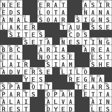 ACROSS 1. Born 4. Part of Q.E.F. 8. SW Saudi Arabia district 12. Begley and Asner 13. Globular water bottle used in Asia 14. Grandmother 15. Of or related to the anus 17. Fly high 18. Attaches a signature 19. Member of a famous L.A. basketball team 21. The 19th letter of the Greek alphabet 23. Compass dir. 24. Locates 26. Music discs 28. Stalk of a moss capsule 30. Snuggling 34. English channel? 37. Roberta Peters solo 39. Type of rug 40. Snakelike fish 41. Annoying sound 43. Eastern Standard Time (abbr.) 44. Den 46. Thailand, formerly 47. A female animal or person 48. Contrary to your interests or welfare 51. _ and Stitch 54. Affirmative reply 55. Canadian anthropologist Darnell 58. Health resort 61. Baseball player Mel 63. Rends 65. Components 67. Brightly colored fish 71. Singer James 72. Mountain range southwest of Kyrgyzstan 73. Inventor's middle name 74. The 18th letter of the Arabic alphabet 75. Relief 76. Colored 77. French article DOWN 1. Actress Patricia 2. Ferber et al. 3. 1973 Nobel Price Winner (Physics) Leo 4. Raised railways 5. Friend of Pooh 6. "One Day ___ Time" 7. Small pie 8. Black tropical American cuckoo 9. Settles 10. Taverns 11. To erase 16. Allows 18. Soap bubbles 20. To riddle 22. Adept person 25. Comedian Laurel of Laurel & Hardy 27. R.R. building 29. Came up 30. Relating to the nose 31. Angers 32. Soft 33. Yard entry 34. Actor Lugosi 35. Necklace unit 36. 154 in Roman numerals 38. One more than two 42. Arab leader 45. Marina Del _, California 49. Vintage cars 50. Fast jet (abbr.) 52. Allow 53. Double curve, resembling the letter S 56. Brizilian seaport 57. Nick name for Arthur 58. Practice fight 59. Light colored 60. Caspian sea tributary 62. Frog relative 64. Without 66. Teat (slang) 68. Strand of rope, yarn or thread 69. "___ Maria" 70. Possessed