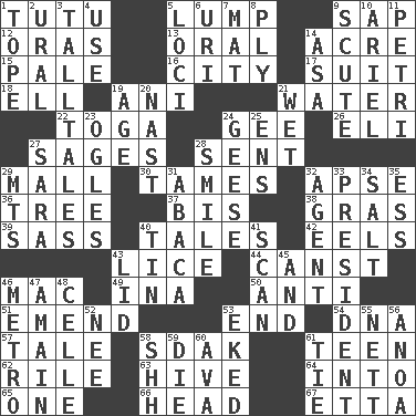 ACROSS 1. Ballerina skirt 5. Mass 9. Plant excrement 12. Mouths or openings 13. Relating to the mouth 14. Measure of real estate 15. Light colored 16. Municipality 17. Costume for a special activity 18. Pipe bend 19. Cuckoo 21. Wetness 22. Ancient Roman robe 24. Unit of force equal to gravity 26. Biblical high priest 27. Gurus 28. Transmitted 29. Shopping center 30. Softens 32. Domed church section 36. Relationship diagram 37. Twice 38. Pate de foie ____ 39. Backtalk 40. Falsehoods 42. Snakelike fish 43. Louse (plural) 44. 2nd pers. sing. pres. of can (arch.) 46. Apple computer (short form) 49. _ tizzy (2 wds.) 50. Opposed to 51. Make improvements or corrections to 53. Conclude 54. Heredity factor (abbr.) 57. Lie 58. Neighbor of Neb. 61. Adolescent 62. Cause heat under the collar 63. Hub of activity 64. To the inside or interior of 65. Single 66. Froth on beer 67. Singer James DOWN 1. Drink excessively 2. Mountain range 3. Baron Munchausen's specialties 4. Purpose 5. Event scenes 6. RI univ. 7. Floor protector 8. Travel a route regularly 9. Scutum 10. Satellite of Uranus 11. _ dish (used to culture cells) 14. White ___ sheet 19. Mature 20. Political cartoonist Thomas 21. Dripping 23. Stares 24. Honkers 25. Followers of ems 27. "Two Mules for Sister ____" 28. Grin 29. Mountains (abbr.) 31. Phillipine bananalike plant 32. Representative 33. Elected leader of a country 34. Table seasoning 35. Curvy letter 40. Shallow baking pan 41. Examine minutely or intensely 43. Flaplike covering 45. Added to 46. Paris' subway 47. At full speed 48. Cell (Danish) 52. Born 53. Supplemented with great effort 55. Remaining after all deductions 56. Small Philippine buffalo 58. Quiet! 59. Pass on 60. Actress Gardner 61. Make a knot