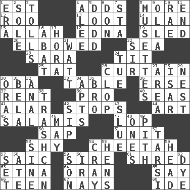 ACROSS 1. Eastern Standard Time (abbr.) 4. Sums up 8. Greater amount 12. Friend of Pooh 13. Plunder 14. Uhlan (variant) 15. Assad's deity 18. Pulitzer Prize-winning author Ferber 19. Downhill vehicle 20. Turned at an angle; bent 22. Ocean 23. "Two Mules for Sister ____" 24. Teat (slang) 25. Make lace 26. Window treatment 30. Chief or king in Benin or Nigeria 33. Eating place 36. Celtic language 37. Monthly bill 39. Adept person 40. Oceans 41. Having or resembling wings 42. Discontinues 44. Tate display 45. Deli grouping 47. Trim (branches) 50. Plant excrement 51. A single undivided whole 53. Like a shrinking violet 54. Leopard's kin 57. Ketch in the Levant 59. Male parent of an animal 61. Tear up 63. Inactive volcano in Sicily 64. Northwest Algerian city 65. Declare 66. Adolescent 67. Negative votes 68. Binary compound DOWN 1. Period 2. Not divided or shared with others 3. For Whom the Bell _____ 4. Toward shelter 5. Texas town _ City 6. Spanish title 7. R.R. building 8. French bagpipes 9. Water jar 10. Actress Charlotte 11. Conclusion 16. Blind as ____ 17. Israeli folk dance 21. Electrical Unit 22. Title for a knight 24. Third day of the wk. 26. Hoof sound 27. Type of rug 28. Austrian river, tributary to the Danube 29. A home for chicks 30. Mouths or openings 31. Actor Lugosi 32. Of or related to the anus 34. Tenement units (abbr.) 35. Sis' sibling 38. File 13 42. Small drink 43. Change direction abruptly 46. Fifth month 48. Singles 49. Heart or essence 52. Tarsus (plural) 53. Trig term 54. Supercomputer manufacturer 55. Coop moms 56. Froth on beer 57. Put into a specified state 58. Had dinner 59. Male child 60. Lyricist Gershwin 62. Color