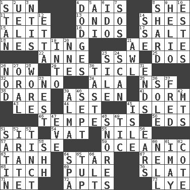 ACROSS 1. Player for Phoenix 4. Raised platform 8. A female animal or person 11. Wig 13. Southwest Nigerian state 14. "______ My Girl" (Turtles hit) 15. Set down 16. "Vaya con ____" 17. Table seasoning 18. Nestling 21. Nest on high 22. Queen of England 1702-14 23. Compass dir. 25. Two (Sp.) 26. Immediately 29. A testis 32. U. of Maine site 34. Chicken ___ king 35. Overdraft (abbr.) 38. Have the gumption 39. NE Netherlands city 41. Dormintory (informal) 43. French article 44. Allow 45. Small island 46. Storms 50. Begley and Asner 51. Be seated 54. Large container 55. The longest river in the world 57. Ascend 59. Pertaining to the sea 63. Hyperbolic tangent 64. Play the lead 67. San ____ (Riviera town) 68. Hankering 69. Whimper 70. Narrow board 71. Fish or hair follower 72. Tenement units (abbr.) 73. Sodium hydroxide DOWN 1. Comedian Laurel of Laurel & Hardy 2. Ubangi River tributary 3. Nuclear Threat Initiatives 4. Evades 5. Cuckoo 6. Wedding promise 7. Mayday 8. Broken piece 9. Sun: prefix 10. _____ Park, CO 12. Singer James 14. Compass dir. 19. To the inside or interior of 20. Compass dir. 21. Leather borer 23. Filth; sediment 24. Examine minutely or intensely 26. Dreamland 27. Taken by mouth 28. Had on 30. Clothes sense 31. Conclusions 33. Egg locale 36. Flatfish 37. Flintstone 39. _ mater 40. Back-to-school mo. 42. Mountains (abbr.) 45. Small island 47. First lady 48. Sounds asleep 49. Nervous spasm 51. Smooth fabric 52. Feeling or showing extreme anger 53. A color or tint 56. Hearing organs 58. Quiet! 60. 1994 drama film starring Jodie Foster 61. "If ____ say so..." 62. ____ d'Azur (French Riviera) 64. Health resort 65. Uncastrated adult male sheep 66. Keyboard modifier key