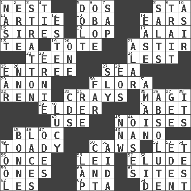 ACROSS 1. A home for chicks 5. Two (Sp.) 8. R.R. building 11. Nick name for Arthur 13. Chief or king in Benin or Nigeria 14. Hearing organs 15. Founders of families 16. Chop off 17. Jai ____ 18. Beverage made from leaves 19. Carry 21. Having gotten out of bed 22. Adolescent 24. For fear that 25. Main course 27. Ocean 29. At once, immediately (arch.) 30. Plants 32. Painter Guido (1575-1642) 33. Trading vessels 35. Wise men 39. A person who is older than you are 41. Collude with 42. Purpose 43. Annoying sounds 45. Alliance 48. Billionth: prefix 49. Sycophant 50. Crow sounds 52. Allow 55. Single time 56. Flowery wreath 57. Evade 59. Washington bills 60. Added to 61. Settings 62. French article 63. Parent Teacher Association (abbr.) 64. Incision DOWN 1. Political cartoonist Thomas 2. 4th largest of the Great Lakes 3. Ski resort town in Vermont 4. Make a knot 5. Stupid person 6. Mitch Miller's instrument 7. Plant excrement 8. Table seasonings 9. Distinguishing feature 10. SW Saudi Arabia district 12. First name in cosmetics 14. Comfort 20. Single 21. Having or resembling wings 23. Bert's buddy 25. Ewer handle 26. Compass dir. 27. Playfully artful 28. Greek goddess of the dawn 30. Distant 31. At full speed 33. Music discs 34. Portuguese money of account (variant) 36. Utter; complete 37. Unit of force equal to gravity 38. ___ a Wonderful Life 40. "I Love _" 43. Compass dir. 44. Fertile tracts in a desert 45. Child's nurse 46. Shoestrings 47. Lyric poems 49. Utensil 50. Penny 51. Opera by Verdi 53. Paradise 54. Trial 56. Pet locale 58. Flaplike covering
