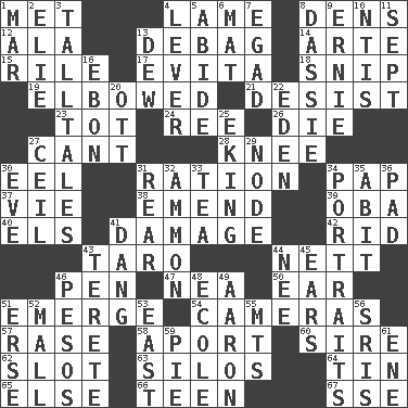 ACROSS 1. Was introduced to 4. Unable to walk 8. Hiding places for outlaws 12. Wing 13. Debunk (Brit. slang) 14. Johnson of "Laugh-In" 15. Cause heat under the collar 17. Webber/Rice musical 18. Sever or remove by pinching or nipping 19. Turned at an angle; bent 21. Cease 23. Small child 24. To riddle 26. Pass on 27. Patter 28. Leg joint 30. Snakelike fish 31. Food allowance for one day 34. Infant food 37. Compete 38. Make improvements or corrections to 39. Chief or king in Benin or Nigeria 40. Raised railways 41. Break 42. To free from 43. Edible starchy tuberous root 44. Remaining after all deductions 46. Fenced enclosure 47. Teachers' org. 50. Ewer handle 51. Develop 54. Devices for capturing images 57. Raze (variant) 58. To the left, to Queeg 60. Beget 62. Narrow, elongated depression 63. Grain storage towers 64. Shallow baking pan 65. Otherwise 66. Adolescent 67. Compass dir. DOWN 1. Impair 2. Writer Wiesel 3. Baron Munchausen's specialties 4. Crowbar 5. Tolerate 6. Floor covering 7. Mild oath 8. Hyrax 9. Bert's buddy 10. Nuclear Threat Initiatives 11. Back-to-school mo. 13. Morning condensation 16. Inky black, to poets 20. Baseball player Mel 22. Genesis locale 25. Supplementing with great effort 27. To provide with a ceiling 29. Thickened enlargement 30. Night before a holiday 31. Located in or toward the back 32. ID or VA city 33. Beverage made from leaves 34. Likenesses of persons 35. "This won't hurt ____!" 36. Writing tablet 41. Mild oath, euphamism for damn 43. Cigar-shaped 44. Born 45. Hearing organs 46. Mexican monetary units 48. Learning spot: Fr. 49. Composer Copland 51. Celtic language 52. Promenade 53. Compass direction 55. Mountains (abbr.) 56. Indian titles of respect 59. Sliced dessert 61. Compass dir.