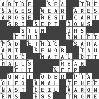 ACROSS 1. Tolerate 6. Ocean 9. Definite Article 12. Gurus 13. Put on (as clothing) 14. Ancient Greek god of war 15. Came up 16. Remainder 17. Haul 18. _ Lanka 19. Back-to-school mo. 20. Charged particles 21. Astound 23. Big collection agency 24. Needle holder 25. An arm off of a larger body of water 28. Writing tablet 30. Moral principle 34. "Two Mules for Sister ____" 35. Cuckoo 36. Sir (Sp.) 38. The 19th letter of the Greek alphabet 39. Ear part 41. Brizilian seaport 43. Baseball player Mel 44. Promenades 46. Hitchcock's "____ Window" 48. Biblical high priest 49. Shed a tear 50. A single undivided whole 51. River in Europe 53. Parent Teacher Assoc. 56. Margarine 57. Of or related to the anus 58. Giggle 60. Political cartoonist Thomas 61. To provide with a ceiling 62. Composer Copland 63. Followers of ems 64. Double-curved letter 65. Heavy duty weighing machine DOWN 1. White ___ sheet 2. Oblong pieces of solid material 3. Composer Stravinsky 4. Cease 5. Compass dir. 6. Ooze 7. Compass direction 8. Tate display 9. Interpreter 10. Possessive pronoun 11. Eastern Standard Time (abbr.) 13. Songbird 14. Oak nuts 19. Sets or collections 20. One more than two 22. Third day of the wk. 24. The property of being fit to eat 26. Part of Q.E.F. 27. Drawn tight 28. Inside of hand 29. Small Philippine buffalo 31. Layer 32. _ tizzy (2 wds.) 33. Small bed 37. Less widely known 40. American author Paul (1891-1958) 42. Area sheltered from the wind 45. Be seated 47. Become visible 49. Water source 50. Uhlan (variant) 51. Singles 52. Raised platform 54. Through, poetically 55. A really long time 56. Single 57. Adept person 58. Make lace 59. Compass dir.