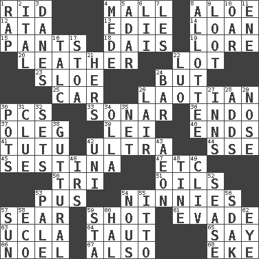 ACROSS 1. To free from 4. Promenade 8. _ vera 12. "One Day ___ Time" 13. Singer Brickell 14. Grant temporary use of 15. Leg coverings 18. Raised platform 19. Old wives' tales, e.g. 20. Cordwainer's material 22. Car dealer's back yard 23. _ gin 24. Yet 25. Auto 26. Of or relating to Laos or its people 30. Personal Computers (abbr.) 33. Echolocation 36. Inside; within (prefix) 37. Cassini of fashion 39. Flowery wreath 40. Conclusions 41. Ballerina skirt 42. Extremist 44. Compass dir. 45. French poetic form 47. And so on (abbr.) 50. Three (prefix) 51. Lubricates 53. Suppuration 54. Fools 57. Scorch 59. Opportunity 61. Dodge 63. Southern CA. univ. 64. Strained 65. Declare 66. Christmas carol 67. In addition 68. Make supply last DOWN 1. Reproach for some lapse or misdeed 2. Slanted text style (abbr.) 3. Natives or inhabitants of Denmark 4. Ancient Persian 5. The sixth month of the Jewish calendar 6. Cards in a Roman deck? 7. French article 8. One to whom something is allotted 9. Spoils 10. Rowing implement 11. Compass dir. 16. Baby powder 17. Portico 21. Possessive pronoun 22. Nilotic language 24. Soap unit 26. Den 27. Taverns 28. Does sums 29. Olfactory organ 30. Plant holders 31. A slight indication 32. Arranges properly for use 34. Spanish pot 35. Fish or hair follower 38. From the throat 42. Corn or form start 43. A really long time 46. Big collection agency 48. Prong on a fork 49. 154 in Roman numerals 52. Gospel singer Marvin 53. Light colored 54. Good sense 55. "Tell ____ the Marines!" 56. Neighbor of Neb. 57. Player for Phoenix 58. Environmental prefix 59. R.R. building 60. Actor Linden 62. Sight organ
