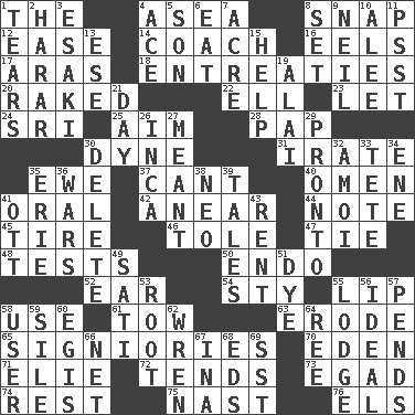 ACROSS 1. Definite Article 4. At sea 8. Fastener 12. Relaxation 14. Team commander 16. Snakelike fish 17. Caspian sea tributary 18. Pleas 20. Moved through 22. Pipe bend 23. Allow 24. _ Lanka 25. Direct toward a target or goal 28. Infant food 30. Unit of force 31. Feeling or showing extreme anger 35. She-sheep 37. Patter 40. Sign of things to come 41. Relating to the mouth 42. Approach 44. Brief written record 45. Become fatigued 46. Lacquered or enameled metalware 47. Make a knot 48. Trials 50. Inside; within (prefix) 52. Ewer handle 54. Filthy place 55. Mouth edge 58. Purpose 61. Pull behind 63. Wear away 65. Seigniories (variant) 70. Paradise 71. Writer Wiesel 72. Watches over 73. Mild oath 74. Repose 75. Political cartoonist Thomas 76. Raised railways DOWN 1. Rends 2. Ethiopian city, capital of Harari 3. 1973 Nobel Price Winner (Physics) Leo 4. Adept person 5. Manchild 6. Consume 7. Measure of real estate 8. Arrange properly for use 9. Famous astronaut Armstrong 10. Toward shelter 11. Inconspicuous attention getter 13. Compass dir. 15. Assist 19. Jai _ 21. 24 hours 26. South American Indian 27. Intended 29. Right away 30. Keyboard key 32. Mine, in Marseilles 33. False hair 34. Compass dir. 35. One of the Great Lakes 36. Armed conflicts 38. Modern: prefix 39. Stories 41. Baseball player Mel 43. Monthly bill 49. Suttee (variant) 51. Color 53. Carrot, for example 55. Cabin 56. Perfect 57. Depends 58. One who makes use of a thing 59. Drop; flow; fall 60. Armor plate that protects the chest 62. Songbird 64. Portuguese money of account (variant) 66. Fish or hair follower 67. _ tizzy (2 wds.) 68. Begley and Asner 69. Fast jet (abbr.)
