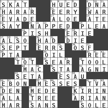 ACROSS 1. Three-handed card game 5. Became colored 9. Heredity factor (abbr.) 12. Ethiopian city, capital of Harari 14. Suggestive of the supernatural 15. Armed conflict 16. Dodge 17. Medicinal plant 18. Had dinner 19. Declare 20. Slept 23. Entreaty 24. Expression of disdain 25. 4th largest of the Great Lakes 27. In addition 30. Possessed 32. Expire 33. Back-to-school mo. 34. Blunders 36. Order of Saint Francis (abbr.) 38. Parent Teacher Association (abbr.) 39. Lubricate 40. To separate or throw off 43. Small child 46. Burn superficially 48. Implement 49. Apple computer (short form) 51. R.R. building 52. Hindu god of fire 53. Stalk of a moss capsule 54. Son of Isaac 56. Inky black, to poets 58. Makes clutter 61. Federal power corp. 64. Lair 65. Ancient Persian 66. Japanese brewing company 68. Chicken ___ king 69. Family _ (genealogy) 70. Believer in; advocate of (suffix) 71. Third mo. 72. Without 73. Flatfish DOWN 1. "______ My Girl" (Turtles hit) 2. Polynesian shrub of the pepper family 3. Like ___ of sunshine 4. Small amount or degree 5. Pile 6. Ubangi River tributary 7. Worn away 8. Color 9. A sleeping potion; an opiate (poet.) 10. Nathan's nickname 11. Length times width 13. Painter Guido (1575-1642) 21. American tennis player Robert 22. N Egypt peninsula 23. Sliced desserts 24. Cooking vessel 26. River (Sp.) 27. Cleo's killer 28. Allow 29. Petty quarrel 31. Frees from moisture 35. Chalkboards 37. Tree-dwelling hopper 41. A really long time 42. Connecticut Ivy Leaguer 44. Sign of something about to happen 45. Make lace 47. Raze (variant) 48. The 19th letter of the Greek alphabet 50. Device for capturing images 53. Echolocation 55. "____ silly question..." 56. Dutch treat 57. Actor Lugosi 59. Locale of original sin 60. Observes 61. Musical group of three 62. Small bottle 63. Singer Murray 65. Mountains (abbr.) 67. Big collection agency