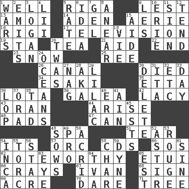 ACROSS 1. Not ill 5. Port city in Latvia 9. For fear that 13. Mine, in Marseilles 14. Arabian gulf 15. Nest on high 16. Swiss mountan, "Queen of the Mountains" 17. Boob tube 19. R.R. building 20. Beverage made from leaves 21. Assist 22. Conclusion 23. Overwhelm 25. To separate or throw off 26. Lessep's creation 30. Passed on 34. 1973 Nobel Price Winner (Physics) Leo 35. Singer James 36. Globular water bottle used in Asia 39. An organ shaped like a helmet 42. Made of lace 43. Northwest Algerian city 44. Originate 46. Groovy apts. 47. 2nd pers. sing. pres. of can (arch.) 48. Health resort 51. Rend 54. It is 57. The grampus (Milton) 58. Music discs 60. Mayday 62. Music shop? 65. Needle holder 66. Trading vessels 67. _ the terrible 68. Attach a signature 69. Land measure 70. Have the gumption 71. Family _ (genealogy) DOWN 1. Armed conflicts 2. Gives off 3. Utah city north of Ogden 4. Cards in a Roman deck? 5. Pace 6. The content of cognition 7. Set 8. Approach 9. French article 10. One of the Great Lakes 11. The Jewish people; Israel 12. Look after 15. Helper 18. Compete 20. It was, poetically 24. Seas 27. Tired old horse 28. Alias (abbr.) 29. Pale purple color 30. Erase 31. Call ___ day 32. And so on (abbr.) 33. 24 hours 36. Chop off 37. Mouth or opening 38. Bit 40. Epoch 41. The 18th letter of the Arabic alphabet 45. Fast planes 48. Sty mamas 49. Adept person 50. Bitter 52. Moving about 53. Makeup applied to the cheeks 54. South American Indian 55. Torque (variant) 56. Play the lead 58. Burn to charcoal 59. Unit of force 61. Trig term 63. Sight organ 64. Federal power corp. 65. Eastern Standard Time (abbr.)