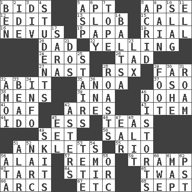 ACROSS 1. Auction offers 5. Fitting 8. Domed church section 12. Prepare for publication 13. Messy guy 15. Give a ring to 16. Congenital growth or mark on the skin 18. Dad 19. Monetary unit of Yemen 20. Male parent 22. Crying or shouting loudly 24. Greek god of love 26. Small boy 27. Political cartoonist Thomas 28. Acura sports coupe 29. Distant 32. "This won't hurt ____!" 35. Small Philippine buffalo 37. Bear (Spanish) 38. Not women's 39. _ tizzy (2 wds.) 40. Capital of the state of Qatar 41. Clumsy lout 42. Ancient Greek god of war 43. A distinct part 44. Wedding promise 45. Curvy letter 46. Beverages made from leaves 49. Arrange properly for use 50. Table seasoning 51. Short socks 55. _ de Janeiro 56. Jai ____ 57. San ____ (Riviera town) 59. _____ steamer (cargo ship) 63. Small pie 64. Commotion 65. It was, poetically 66. Curves 67. And so on (abbr.) 68. Back-to-school mo. DOWN 1. Benjamin's nick name 2. Binary compound 3. HTML Container Element 4. SAT takers 5. Viper 6. Romp 7. Drink excessively 8. Sour-tasting 9. Ache 10. Volcanic refuse 11. Pipe bend 14. Greek mezzo-soprano Agnes 17. "Two Mules for Sister ____" 21. Two (Sp.) 23. Not strict 25. Flight of steps 28. Ridicules or criticizes harshly 29. One third of a yard 30. American tennis player Robert 31. Wander 32. Mine, in Marseilles 33. Necklace unit 34. A message received and understood 36. Compass dir. 40. What propaganda does 42. Michaelmas daisies 45. Snakelike fish 47. Hearing organ 48. Came down and settled, as after flight 49. Burlesque acts 51. Having or resembling wings 52. Drug cop 53. Wig 54. Stricken, poetically 56. _ moment's notice (2 wds.) 58. The grampus (Milton) 60. Deep reverence 61. Atlas unit 62. Pacific Standard Time (abbr.)