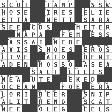 ACROSS 1. Native of Scotland 5. Pack (down) 9. Compass dir. 12. Stockings 13. Angers 14. Writer Wiesel 15. Singer James 16. Remaining after all deductions 17. "Two Mules for Sister ____" 18. Perceive with the eye 19. Music discs 21. Distance measurement 22. California wine valley 24. Opposite of masc. 26. Double-curved letter 27. Slender Brazilian palm 28. Ancient Persian 29. Opinion 30. Imelda's hoard 32. Greek god of love 36. Not recorded 37. Help 38. Scratch 39. An important port of Yemen 40. With motion or animation 42. At sea 43. Table seasoning 44. Ms. Damita and namesakes 46. Teachers' org. 49. Shoshoni 50. Supplemented with great effort 51. Sea 53. Enemy 54. Epoch 57. Australian parrot (variant) 58. Fermented drink made from hops 61. Clip 62. Set down 63. Former U.S. Attorney General Janet 64. Jazz singing style 65. Born 66. Cassini of fashion 67. Snakelike fish DOWN 1. "______ My Girl" (Turtles hit) 2. ____ d'Azur (French Riviera) 3. Clearly or manifestly demonstrative 4. Afternoon social gathering 5. Metal containers 6. "We ___ not amused" (Victoria) 7. Was introduced to 8. Pacific Standard Time (abbr.) 9. Chalkboard 10. Begets 11. Erodes 14. Compass dir. 19. Tax preparer (abbr.) 20. Raised platform 21. Madame (abbr.) 23. NE Netherlands city 24. Eats 25. Begley and Asner 27. Enthusiastic 28. Damp 29. In the manner of 31. White Person, in Hawaii 32. Peak District village in England 33. Dwelling 34. Singles 35. R.R. building 40. Floor protector 41. Butter sub 43. Player for Phoenix 45. Mamie's mate 46. Pitcher Ryan 47. Learning spot: Fr. 48. Nest on high 52. Small island 53. Tree-dwelling hopper 55. Monetary unit of Yemen 56. Tenement units (abbr.) 58. Sis' sibling 59. Snakelike fish 60. Compass dir. 61. Compass dir.