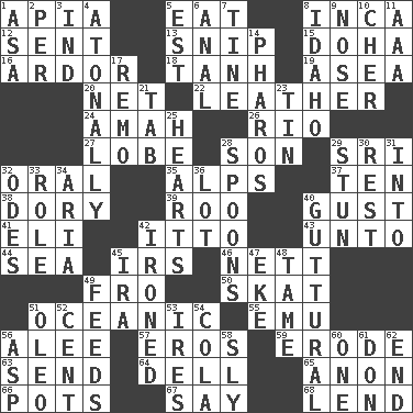 ACROSS 1. Capital of Western Samoa 5. Ingest 8. South American Indian 12. Transmitted 13. Sever or remove by pinching or nipping 15. Capital of the state of Qatar 16. Zeal 18. Hyperbolic tangent 19. Toward the sea 20. Fish or hair follower 22. Cordwainer's material 24. Nursemaid 26. _ de Janeiro 27. Ear part 28. Male offspring 29. Indian title of respect (Mr.) 32. Of the mouth 35. High mountains 37. Nine, plus one 38. Rowboat 39. Friend of Pooh 40. Abrupt rush of wind 41. Connecticut Ivy Leaguer 42. "Tell ____ the Marines!" 43. To (old English) 44. Ocean 45. Big collection agency 46. Remaining after all deductions 49. Away 50. Three-handed card game 51. Pertaining to the sea 55. Australian flightless bird 56. Toward shelter 57. Greek god of love 59. Eat (away) 63. Post 64. Small valley 65. Soon (poet.) 66. Cooking vessels 67. Declare 68. Grant temporary use of DOWN 1. White ___ sheet 2. For each 3. Indiana (abbr.) 4. Without tonality 5. Eastern Standard Time (abbr.) 6. Of or related to the anus 7. Prong on a fork 8. Potato state 9. Olfactory organ 10. "Mermaids" star 11. American Automobile Association (abbr.) 14. N Egypt peninsula 17. San ____ (Riviera town) 21. Keyboard key 23. Metal container 25. Centers 28. Soup utensils 29. Astound 30. Remainder 31. To the inside or interior of 32. Lyric poems 33. Hero or heavy, e.g. 34. Operatic vocal solo 36. Car dealer's back yard 40. From the throat 42. Pressed 45. Retirement account (abbr.) 47. Supplement with great effort 48. Not wild 49. Eats 51. Margarine 52. Penny 53. Angers 54. Root beer relative 56. Cleo's killer 58. Cunning 60. Single 61. Spanish title 62. Conclude