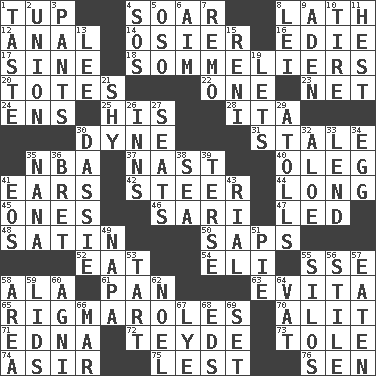 ACROSS 1. Uncastrated adult male sheep 4. Fly high 8. Thin strip of wood or metal 12. Of or related to the anus 14. Flexible twig of a willow tree 16. Singer Brickell 17. Trig term 18. Wine waiters 20. Lugs 22. Single 23. Fish or hair follower 24. Followers of ems 25. Part of HMS, perhaps 28. Call ___ day 30. Centimeter-gram-second unit of force 31. Having lost freshness 35. Basketball assoc. 37. Political cartoonist Thomas 40. Cassini of fashion 41. Hearing organs 42. Bull 44. Having great length 45. Singles 46. Indian skirt 47. Directed 48. Smooth fabric 50. Plant excrements 52. Erode 54. Biblical high priest 55. Compass dir. 58. According to 61. Baking dish 63. Webber/Rice musical 65. Complicated, petty procedures 70. Came down and settled, as after flight 71. Pulitzer Prize-winning author Ferber 72. Miss Universe 1986, Barbara Palacios _ 73. Lacquered or enameled metalware 74. SW Saudi Arabia district 75. For fear that 76. Elected rep. DOWN 1. Clothes sense 2. The state of being joined or united 3. Leg coverings 4. Distress signal 5. Bear (Spanish) 6. Direct toward a target or goal 7. San ____ (Riviera town) 8. Flowery wreath 9. An important port of Yemen 10. Become fatigued 11. Command 13. Area sheltered from the wind 15. Painter Guido (1575-1642) 19. Allows 21. Like a shrinking violet 26. Lodging establishments 27. Theater features 29. Ringlike coral islands and reefs 30. Hyrax 32. Medicinal plant 33. Grant temporary use of 34. Oval reproductive body of a fowl 35. Grandmother 36. Cy Young winner Saberhagen 38. Ocean 39. Laconic 41. Greek goddess of the dawn 43. Monetary unit of Yemen 49. California wine valley 51. Sliced dessert 53. Small pie 55. Grain storage towers 56. Vertical member of a panel or frame 57. Eroded 58. Type of rug 59. Hats (slang) 60. Hindu god of fire 62. Christmas carol 64. Large container 66. Impair 67. Sodium hydroxide 68. Begley and Asner 69. Arrange properly for use