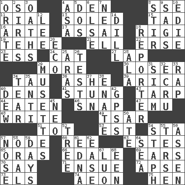 ACROSS 1. Bear (Spanish) 4. An important port of Yemen 8. Compass dir. 11. Monetary unit of Yemen 13. Having a sole or soles 15. Bit 16. Johnson of "Laugh-In" 17. Slender Brazilian palm 18. Swiss mountan, "Queen of the Mountains" 19. Giggle 21. Pipe bend 22. Celtic language 23. Double-curved letter 24. Domesticated feline 27. Infant locale 29. Greater amount 30. Failure 34. The 19th letter of the Greek alphabet 36. American tennis player Robert 39. N. Chile seaport 40. Cub Scout units 41. Feeling sharp psychological pain 43. Canvas cover 44. Eroded 46. Fastener 47. Australian flightless bird 48. Compose 49. Russian ruler of old 51. Small child 53. Eastern Standard Time (abbr.) 54. R.R. building 57. Thickened enlargement 60. Portuguese money of account (variant) 63. _____ Park, CO 65. Mouths or openings 66. Peak District village in England 69. Hearing organs 70. Declare 71. Follow as a consequence or result 72. Domed church section 73. Raised railways 74. A really long time 75. Layer DOWN 1. Declaim 2. Titles for men of rank and authority 3. Profane or obscene expressions 4. White ___ sheet 5. Two (Sp.) 6. Otherwise 7. Actress Patricia 8. Use a swizzle stick 9. Droops 10. Singer Brickell 12. Area sheltered from the wind 14. Deli pickle 18. News announcer 20. Environmental prefix 25. Ancient river in northeast Turkey 26. Trials 28. Chicken ___ king 29. French bagpipes 31. Thailand, formerly 32. Shade of tan 33. Strike 34. Separate forcefully 35. Against 37. Attila the _ 38. Related on the mother's side 40. Morning condensation 42. Global Positioning Systems (abbr.) 45. Modern: prefix 50. Had dinner 52. Woody plant 54. Staphylococcus 55. Laconic 56. NE Netherlands city 57. Characteristic smell of wine 58. Relating to the mouth 59. 24-hour periods 61. Pulitzer Prize-winning author Ferber 62. Relaxation 64. Ocean 67. Nilotic language 68. Car or cant ending