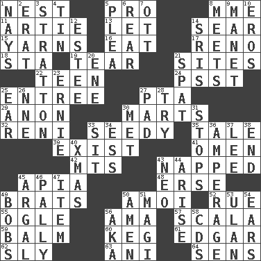ACROSS 1. Egg locale 5. Adept person 8. Madame (abbr.) 11. Nick name for Arthur 13. Allow 14. Dry up 15. Tall tales 16. Ingest 17. Western Nevada city 18. R.R. building 19. Lacerate 21. Settings 22. Adolescent 24. Inconspicuous attention getter 25. Main course 27. Parent Teacher Assoc. 29. Soon (poet.) 30. Shops 32. Painter Guido (1575-1642) 33. Morally degraded 35. Falsehood 39. Be 41. Sign of things to come 42. Mountains (abbr.) 43. Slept 45. Capital of Western Samoa 48. Celtic language 49. Naughty children 50. Mine, in Marseilles 52. Regret 55. Stare at amorously 56. Nursemaid (var.) 57. Any of the three canals of the cochlea 59. Lip ointment 60. Barrel 61. _ Allan Poe 62. Cunning 63. Black tropical American cuckoo 64. Elected reps. DOWN 1. Negative votes 2. Part of Q.E.F. 3. Ski resort town in Vermont 4. Metal container 5. Entreaty 6. Posterior 7. Baseball player Mel 8. Confronts 9. French painter Edouard 10. Greek god of love 12. First name in cosmetics 14. Indian titles of respect 20. Compass dir. 21. Petty quarrel 23. Bert's buddy 25. Hearing organ 26. Compass dir. 27. Writing tablet 28. Attempt 30. Was introduced to 31. Constricts 33. Be seated 34. Curvy letter 36. Electrical Measurement 37. Area sheltered from the wind 38. Conclusion 40. Dec. holiday 43. Modern: prefix 44. Get up 45. Therefore, facetiously 46. Friendly 47. A whole individual unit 49. Moves up and down 50. So be it 51. Wise men 53. ____ Bator, Mongolia 54. Hearing organs 56. Alias (abbr.) 58. Music discs