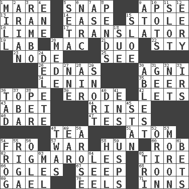 ACROSS 1. Female horse 5. Fastener 9. Domed church section 13. SW Asia republic 14. Comfort 15. Fur scarf 16. Welles in "The Third Man" 17. Interpreter 19. Experiment locale 20. Apple computer (short form) 21. Superhero pair 22. Filthy place 23. Thickened enlargement 25. Perceive with the eye 26. Ferber et al. 30. Hindu god of fire 34. Soviet premier 1918-24 35. Fermented drink made from hops 36. Drink excessively 39. Eat (away) 42. Allows 43. Collude with 44. Wash lightly 46. Have the gumption 47. Trials 48. Afternoon social gathering 51. Smallest unit of an element 54. From 57. Armed conflict 58. Attila the _ 60. Director Reiner 62. Complicated, petty procedures 65. Become fatigued 66. Stares at amorously 67. Ooze 68. Carrot, for example 69. Highlander 70. Snakelike fish 71. Taverns DOWN 1. Place where flour is made 2. Believer in; advocate of (suffix) 3. Role for Stallone 4. Compass dir. 5. Stalk of a moss capsule 6. Drug cop 7. White ___ sheet 8. Depends 9. _ moment's notice (2 wds.) 10. Plant holders 11. Position in a hierarchy or organization 12. Suggestive of the supernatural 15. _ gin 18. Institute legal proceedings 20. Ancient Persian 24. Keyboard key 27. Compass dir. 28. Atmosphere 29. Derisive sound 30. Most capable 31. Unit of force equal to gravity 32. Fish or hair follower 33. Big collection agency 36. Small amount or degree 37. Chief or king in Benin or Nigeria 38. For each 40. Expire 41. Followers of ems 45. Comedian Laurel of Laurel & Hardy 48. It was, poetically 49. Ewer handle 50. Came up 52. Constellation of myth 53. Person of subnormal intelligence 54. Tree-dwelling hopper 55. Port city in Latvia 56. Stare 58. Person who is morally reprehensible 59. United States Postal Service (abbr.) 61. Wagers 63. Cartoonist voice _ Blanc 64. Area sheltered from the wind 65. Three (prefix)