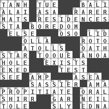ACROSS 1. Hyperbolic tangent 5. Third day of the wk. 8. Indonesian resort city 12. Mountain range southwest of Kyrgyzstan 13. White ___ sheet 14. More valued for its uncommonness 15. Floor protectors 16. Dwellings 19. R.R. building 20. Mood resulting from idleness 21. Otherwise 23. Bear (Spanish) 24. Hat (slang) 27. Spanish pot 30. Printing process, for short 31. Ringlike coral islands and reefs 34. Pledge 35. Play the lead 38. Woman's close-fitting hat 40. Small Philippine buffalo 41. Opening into or through something 42. Is extant 44. Supplemented with great effort 45. Trial 46. Observe 47. Electrical Unit 50. At sea 53. More lively and spirited 57. Nanny (var.) 59. Conciliate 63. Taken by mouth 64. Bake eggs in their shells 65. Slender fish 66. Famous astronaut Armstrong 67. Lacquered or enameled metalware 68. Wily 69. Pulitzer Prize-winning author Ferber DOWN 1. Scottish caps 2. Having winglike extensions 3. Brizilian seaport 4. Part of HMS, perhaps 5. Pacific island yam 6. One who makes use of a thing 7. Relaxation 8. Forbid 9. Curve 10. Area sheltered from the wind 11. Big collection agency 14. San ____ (Riviera town) 17. Wedding promise 18. Two (Sp.) 20. Waist strap 22. Flew 24. Grant temporary use of 25. "Tell ____ the Marines!" 26. Capital of the state of Qatar 28. Car dealer's back yard 29. _ vera 30. Ridicules or criticizes harshly 32. Brine-cured salmon 33. Set or collection 35. "______ My Girl" (Turtles hit) 36. Casino tip 37. Toward shelter 39. Compass dir. 43. Russian ruler of old 47. SW Saudi Arabia district 48. Floor protector 49. 23rd letter of the Greek alphabet 51. Having ears or earlike features 52. At full speed 54. Droops 55. Slanted text style (abbr.) 56. Suggestive of the supernatural 58. Silent film actress Nazimova 59. Pacific Standard Time (abbr.) 60. 17th letter of the Greek alphabet 61. Petroleum 62. Before (prefix) 63. Single
