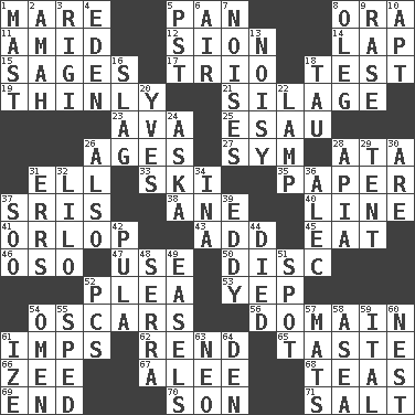 ACROSS 1. Female horse 5. Baking dish 8. Mouth or opening 11. Among 12. The Jewish people; Israel 14. Pet locale 15. Gurus 17. Musical group of three 18. Trial 19. Without force or sincere effort 21. Fodder prepared in a silo 23. Actress Gardner 25. He sold his birthright 26. Eons 27. Symbol (abbr.) 28. "One Day ___ Time" 31. Pipe bend 33. What Jean-Claude Killy likes to do 35. Some stationery 37. Indian titles of respect 38. A saturated hydrocarbon 40. Actor's bit 41. Lowest deck of a ship 43. Increase 45. Ingest 46. Bear (Spanish) 47. Purpose 50. Flat circle 52. Entreaty 53. Slangy assent 54. Motion picture awards 56. Realm 61. Naughty children 62. Tear apart 65. Clothes sense 66. Last letter of the English alphabet 67. Toward shelter 68. Afternoon social gatherings 69. Conclusion 70. Manchild 71. Table seasoning DOWN 1. Vertical spar for supporting sails 2. Housemaid 3. Swiss mountan, "Queen of the Mountains" 4. Genesis locale 5. Pacific Standard Time (abbr.) 6. Wind 7. Annoying sounds 8. Cassini of fashion 9. To erase 10. Fitting 13. Annoyingly loud 16. Volcanic refuse 18. The 19th letter of the Greek alphabet 20. Jacques Cousteau's middle name 22. Desk light 24. "____ silly question..." 26. In addition 28. Capital of Western Samoa 29. Portable shelter 30. "We ___ not amused" (Victoria) 31. Blunders 32. _ and Stitch 34. _ tizzy (2 wds.) 36. Actor Baldwin 37. "Barney Miller" actor Jack 39. Whirlpool 42. Monetary unit of Botswana 44. Passed on 48. Spanish missionary in California 49. Artist's stands 51. Blemish 52. Personal Computers (abbr.) 54. Sign of something about to happen 55. Moved rapidly 57. Floor coverings 58. Toward the sea 59. Slanted text style (abbr.) 60. Egg locale 61. Ending with capital 63. Modern: prefix 64. Lair