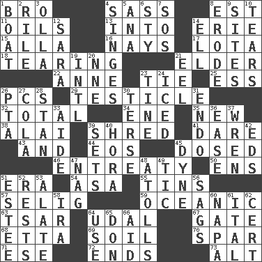 ACROSS 1. Sis' sibling 4. Backtalk 8. Eastern Standard Time (abbr.) 11. Petroleums 13. To the inside or interior of 14. One of the Great Lakes 15. Silent film actress Nazimova 16. Negative votes 17. Globular water bottle used in Asia 18. Separating forcefully 21. A person who is older than you are 22. Queen of England 1702-14 23. Neckwear 25. Double-curved letter 26. Personal Computers (abbr.) 29. One of the two male reproductive glands 32. "_____ Recall" 34. Compass dir. 35. ___ Haven, CT 38. Mountain range southwest of Kyrgyzstan 39. Tear up 41. Have the gumption 43. Also 44. Greek goddess of the dawn 45. Administered medicine 46. Plea 50. Followers of ems 51. Epoch 54. White ___ sheet 55. Canisters 57. Former Milwaukee Brewers owner Bud 59. Pertaining to the sea 63. Russian ruler of old 64. Hereditary estate 67. Yard entry 68. Singer James 69. The visible part of the earth's surface 70. Practice fight 71. Compass dir. 72. Conclusions 73. Keyboard modifier key DOWN 1. Water vessel 2. Cause heat under the collar 3. Rounded earthenware pot or jar 4. Scorches 5. Santa ___, CA 6. Filthy place 7. Mayday 8. Wear away 9. Locates 10. Pulls apart 12. "Two Mules for Sister ____" 14. Pipe bend 19. International (abbr.) 20. Compass dir. 21. Snakelike fish 23. Prong on a fork 24. On the rocks 26. Parent Teacher Assoc. 27. Root beer relative 28. Comedian Laurel of Laurel & Hardy 30. Laconic 31. Inside; within (prefix) 33. Assistant 36. Comfort 37. Songbird 39. Arranges properly for use 40. Israeli folk dance 42. Begley and Asner 45. Centimeter-gram-second unit of force 47. Tired old horse 48. Ringlike coral islands and reefs 49. Nervous spasm 51. First name in cosmetics 52. Musical pauses 53. Having winglike extensions 56. Settles 58. Lyricist Gershwin 60. California wine valley 61. Slanted text style (abbr.) 62. Foregone conclusion 64. Purpose 65. Spanish title 66. Help
