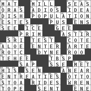 ACROSS 1. Floor protector 4. Place where flour is made 8. Oceans 12. Mouths or openings 14. Goodbye (Sp.) 16. The content of cognition 17. Food container 18. Census information 20. _____ Park, CO 22. Fluid product of inflammation 23. Followers of ems 24. Perceive with the eye 25. Frozen water 28. Turn to the right 30. Demure 31. Moving or stirring 35. _ Lanka 37. Trial 40. ____ d'Azur (French Riviera) 41. _ vera 42. Keyboard key 44. Johnson of "Laugh-In" 45. College mil. group 46. Unit of force 47. Friend of Pooh 48. Giggle 50. Cook's measure (abbr.) 52. Plant excrement 54. Compass dir. 55. Was introduced to 58. Part of HMS, perhaps 61. Elected rep. 63. Approach 65. Pleas 70. "Beetle Bailey" pooch 71. Portico 72. Amusement-park features 73. Songbird 74. Drink excessively 75. Transmitted 76. Compass dir. DOWN 1. Methods 2. Get up 3. Clothes sense 4. Atlas unit 5. Wedding promise 6. Mouth edge 7. Central Nebraska county 8. Be seated 9. Singer Brickell 10. Age 11. Without 13. A female animal or person 15. Snaillike creature with no shell 19. At sea 21. Title for a knight 26. Quote 27. Make improvements or corrections to 29. Fortification 30. Components 32. "Corrida" creature 33. "Tell ____ the Marines!" 34. To riddle 35. A type of plum 36. Writer of Portnoy's Complaint (1969) 38. Filthy place 39. Portable shelters 41. Nonscientific branch of learning 43. Confederate soldiers (slang) 49. Relaxation 51. Ocean 53. Lightbulb-shaped fruit 55. Distance measurement (Brit.) 56. Consumed 57. Marketplace scale 58. Behest 59. To the inside or interior of 60. Close up, plug up 62. Nuclear Threat Initiatives 64. At this time 66. Actress Charlotte 67. Binary compound 68. Car or cant ending 69. Fast jet (abbr.)