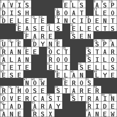 ACROSS 1. Opinion 5. Raised railways 8. Viper 11. Food container 12. Water vessel 13. Lion 14. Erase 17. Happening 19. Artist's stands 21. Opts 22. Conductor's collection 23. Elected rep. 24. Shoshoni 27. Unit of force 29. Health resort 32. Indian princess (variant) 34. Sep. follower 36. Play the lead 37. Actor Alda or Thicke 38. Friend of Pooh 39. Grain storage tower 40. False hair 41. Biblical high priest 42. Exchanges for money 43. Compass dir. 44. Enthusiasm 46. Sodium hydroxide 47. At this time 50. Greek god of love 52. Full of chinks, cracks, or crevices 55. A viewer who gazes fixedly 57. Cloudy 59. Put through a sieve 62. Bit 63. Like ___ of sunshine 64. Travel on an animal 65. One (Scot) 66. Acura sports coupe 67. Afresh DOWN 1. Increase 2. Compete 3. Small island 4. Archer's quiver 5. A really long time 6. Shoestrings 7. Vertical member of a panel or frame 8. Actor Baldwin 9. Posted 10. Plant holders 12. Altar cloth linen 15. Sadhe (variant) 16. Suggestive of the supernatural 18. Lair 20. Poe poem 24. A salt of uric acid 25. Lies 26. Maternal 28. Learning spot: Fr. 29. Free from disturbance or agitation 30. Friendly 31. Came up 33. Compass dir. 35. Rest room 36. Compass dir. 42. Derisive sound 45. Ancient river in northeast Turkey 47. Not either 48. Motion picture award 49. Erodes 51. Father Junipero _ 52. Round or rotation of duties 53. "Terrible" tsar 54. Ancient Persian 55. Filthy place 56. Water falling in drops from the sky 58. Saxophone 60. Binary compound 61. ___ Haven, CT
