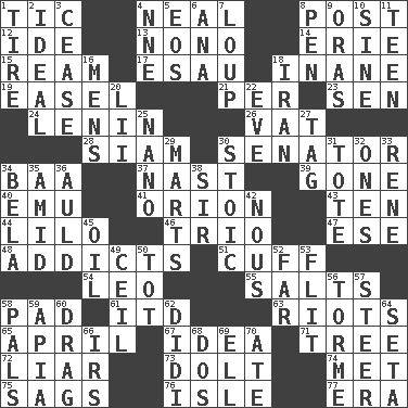 ACROSS 1. Nervous spasm 4. Actress Patricia 8. Mail 12. Binary compound 13. Words to Nanette 14. One of the Great Lakes 15. 480, 500 or 516 sheets of paper 17. He sold his birthright 18. Silly 19. Artist's stand 21. For each 23. Elected rep. 24. Soviet premier 1918-24 26. Large container 28. Thailand, formerly 30. Legislator 34. Sound made by sheep 37. Political cartoonist Thomas 39. Went 40. Australian flightless bird 41. Constellation of myth 43. "___ Little Indians" 44. _ and Stitch 46. Musical group of three 47. Compass dir. 48. Inveterate users 51. Sleeve end 54. Lion 55. Table seasonings 58. Groovy apt. 61. It would 63. Disturbances 65. Showery time 67. It may be bright or harebrained 71. Family _ (genealogy) 72. One who doesn't tell the truth 73. Stupid person 74. Was introduced to 75. Droops 76. Capri or Wight 77. Period DOWN 1. Become fatigued 2. Standard of perfection 3. Desist 4. Compass dir. 5. Greek goddess of the dawn 6. Santa ___, CA 7. Central Nebraska county 8. Animal enclosure 9. Mouths or openings 10. Trig term 11. Adolescent 16. Not women's 18. SW Asia republic 20. Cards in a Roman deck? 22. Night before a holiday 25. Billionth: prefix 27. Label 29. Shops 30. Unemotional 31. Lug 32. Washington bills 33. French philosopher Descartes 34. Actor Lugosi 35. Among 36. Old (Scot.) 38. Title for a knight 42. Good sense 45. Lubricate 49. To provide with a ceiling 50. Small child 52. Distant 53. Sudden quick movement 56. Singer Mel 57. Guide 58. Friends 59. Capital of Western Samoa 60. To be drawn or hauled along 62. "You Light Up My Life" star Conn 64. Bristle 66. Big collection agency 68. Two (Sp.) 69. Pipe bend 70. Had dinner