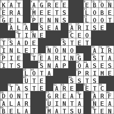 ACROSS 1. Krazy ___ of comics 4. Match 9. Inky black, to poets 13. Period 14. Confronts 15. Ear part 16. Set 17. Actor Sean's family 18. Spoils 19. According to 21. Ocean 22. Originate 24. Prong on a fork 26. Corporate head (abbr.) 27. Sadhe (variant) 29. Proofreading order 30. An arm off of a larger body of water 31. Words to Nanette 33. Atmosphere 36. Sliced dessert 37. Lacerating 40. R.R. building 41. ___ a Wonderful Life 42. Fastener 43. Fertile tracts in a desert 45. Globular water bottle used in Asia 47. First class 48. Shoshoni 49. Fast planes 50. Clothes sense 52. "We ___ not amused" (Victoria) 54. And so on (abbr.) 56. Do not 57. Relatively large 59. Sandy's bark 61. Having or resembling wings 62. National forest in Provo, Utah 63. Teachers' org. 64. Actor Lugosi 65. Taiwanese island in East China Sea 66. Nine, plus one DOWN 1. Barrel 2. Type of rug 3. Baron Munchausen's specialties 4. Electrical Unit 5. Honkers 6. French philosopher Descartes 7. Inactive volcano in Sicily 8. Curvy letter 9. American author Paul (1891-1958) 10. Scornful sounds 11. Mitch Miller's instrument 12. Fish or hair follower 20. Helper 22. Gambison 23. To sift 25. Remaining after all deductions 27. Native american tent (variation) 28. In a ____ (agitated or irritated) 29. Clip 31. Nanny 32. Mouth or opening 33. Helper 34. A distinct part 35. Raze (variant) 38. First name in cosmetics 39. Republicans 44. Johnson of "Laugh-In" 45. A period of five years 46. Baseball player Mel 49. Theater features 50. Lacquered or enameled metalware 51. Of or related to the anus 52. Operatic vocal solo 53. Monthly bill 55. Algonquian 56. Pat or tap gently 57. Chewing product 58. The 19th letter of the Greek alphabet 60. Avid follower