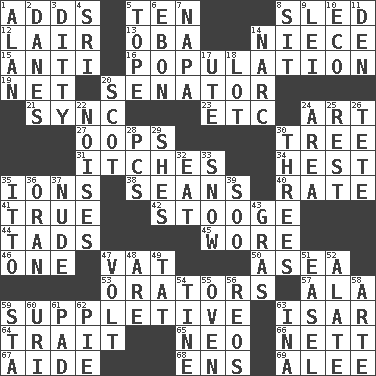 ACROSS 1. Does sums 5. "___ Little Indians" 8. Downhill vehicle 12. Den 13. Chief or king in Benin or Nigeria 14. Sibling's daughter 15. Against 16. Census information 19. Fish or hair follower 20. Legislator 21. Synchronize (abbr.) 23. And so on (abbr.) 24. Nonscientific branch of learning 27. I made a mistake 30. Relationship diagram 31. Strong, restless desires 34. Behest 35. Charged atoms 38. Seines 40. Assign a rank or rating to 41. Loyal 42. Moe Howard, for one 44. Small boys 45. Had on 46. Single 47. Large container 50. At sea 53. Speakers 57. According to 59. Supplying deficiencies 63. Austrian river, tributary to the Danube 64. Distinguishing feature 65. Modern: prefix 66. Remaining after all deductions 67. Helper 68. Followers of ems 69. Toward shelter DOWN 1. ____ Jay Lerner 2. Natives or inhabitants of Denmark 3. Short, simple song 4. Indian title of respect (Mr.) 5. Drink excessively 6. Inky black, to poets 7. California wine valley 8. Be seated 9. Flowery wreath 10. Environmental prefix 11. Lair 14. Drug cop 17. Shoshoni 18. Car dealer's back yard 20. Highlander 22. Annoying sounds 24. Type of rug 25. Remainder 26. False hair 28. Personal Computers (abbr.) 29. "______ My Girl" (Turtles hit) 30. Triads 32. Consume 33. Overwhelm 35. "Tell ____ the Marines!" 36. NW Algerian seaport 37. Unadorned 39. "Barney Miller" actor Jack 43. Pate de foie ____ 47. Electrical Unit 48. "We ___ not amused" (Victoria) 49. Make lace 51. Artist's stand 52. Having winglike extensions 54. Prong on a fork 55. Baking chamber 56. Vintage cars 58. Johnson of "Laugh-In" 59. R.R. building 60. RI univ. 61. Writing tablet 62. Sliced dessert 63. _ tizzy (2 wds.)
