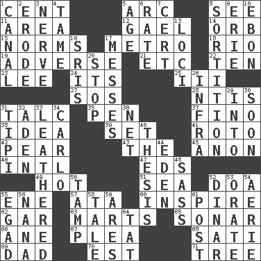 ACROSS 1. Penny 5. Curve 8. Perceive with the eye 11. Type of rug 12. Highlander 14. Globe 15. Typical models 17. Paris' subway 18. _ de Janeiro 19. Contrary to your interests or welfare 21. And so on (abbr.) 22. Nine, plus one 23. Area sheltered from the wind 24. ___ a Wonderful Life 25. One more than two 27. Distress signal 28. Nuclear Threat Initiatives 31. Baby powder 35. Animal enclosure 37. Fine (Spanish) 38. The content of cognition 39. Arrange properly for use 41. Printing process, for short 42. Lightbulb-shaped fruit 43. Definite Article 45. At once, immediately (arch.) 46. International (abbr.) 47. Begley and Asner 49. Being at a high temperature 51. Ocean 52. ___ good deed 55. Compass dir. 57. _ moment's notice (2 wds.) 60. Motivate 62. Slender fish 63. Shops 65. Underwater navigation system 66. A saturated hydrocarbon 67. Entreaty 68. Suttee (variant) 69. Male parent 70. Eastern Standard Time (abbr.) 71. Relationship diagram DOWN 1. Lessep's creation 2. Wear away 3. Effrontery 4. Docile 5. Ripen 6. Assign a rank or rating to 7. Sure thing 8. Casting lots 9. One of the Great Lakes 10. Inky black, to poets 13. Event scenes 16. Indian titles of respect 17. Makes clutter 20. Close up, plug up 26. Kind of red light 29. To the inside or interior of 30. Within a short period 31. Native american tent (variation) 32. Arabian gulf 33. Resembling or made to resemble leather 34. Monte _, Las Vegas Hotel/Casino 36. Fish or hair follower 40. College paper 44. Locale of original sin 48. Backtalk 50. Pack (down) 52. Middle Eastern gold or silver currency 53. Speak pompously 54. Nest on high 55. Mild oath 56. Grandmother 58. Story 59. Ancient Greek god of war 61. Mail 64. Make lace