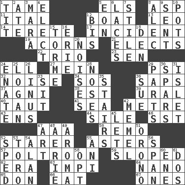 ACROSS 1. Docile 5. Raised railways 8. Cleo's killer 11. Slanted text style (abbr.) 12. Water vessel 13. Lion 14. Cigar-shaped 17. Happening 19. Oak nuts 21. Opts 22. Musical group of three 23. Elected rep. 24. Pipe bend 27. Chow _ 29. Air pressure measure (abbr.) 32. Annoying sound 34. Mayday 36. Plant excrements 37. Hindu god of fire 38. Eastern Standard Time (abbr.) 39. Mountain range 40. Tense 41. Ocean 42. Distance measurement (Brit.) 43. Followers of ems 44. Filth; sediment 46. Fast jet (abbr.) 47. American Automobile Association (abbr.) 50. San ____ (Riviera town) 52. A viewer who gazes fixedly 55. Michaelmas daisies 57. Characterized by complete cowardliness 59. Slanted 62. Period 63. Body of Kaffir warriors 64. Billionth: prefix 65. Spanish title 66. Ingest 67. Singles DOWN 1. Teat (slang) 2. Had dinner 3. Hindu Mythology: god of death 4. Voters do this 5. Age 6. Shoestrings 7. Vertical member of a panel or frame 8. Actor Baldwin 9. Emitted 10. Plant holders 12. Again 15. Singer Mel 16. One of the Great Lakes 18. Lair 20. Annoying sounds 24. Related on the mother's side 25. Utah city north of Ogden 26. "_ and Lucy" (Charlie Brown theme song) 28. Olfactory organs 29. Actors' quests 30. Practice fights 31. Small island 33. Be seated 35. Flight of steps 36. Institute legal proceedings 42. Klaipeda city 45. Allows 47. Nonscientific branch of learning 48. Nest on high 49. Odor 51. U. of Maine site 52. Moved rapidly 53. "Corrida" creature 54. Actor Alda or Thicke 55. Black tropical American cuckoo 56. Connect, as a bridge 58. Choose 60. Compass dir. 61. Two (Sp.)
