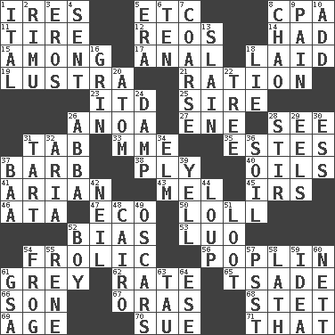 ACROSS 1. Angers 5. And so on (abbr.) 8. Tax preparer (abbr.) 11. Become fatigued 12. Vintage cars 14. Possessed 15. Amid 17. Of or related to the anus 18. Put down 19. A period of five years 21. Food allowance for one day 23. It would 25. Title for a man of rank and authority 26. Small Philippine buffalo 27. Compass dir. 28. Perceive with the eye 31. Bar bill 33. Madame (abbr.) 35. _____ Park, CO 37. Sharp remark 38. Travel a route regularly 40. Lubricates 41. Believer in; advocate of (suffix) 43. Cartoonist voice _ Blanc 45. Big collection agency 46. "One Day ___ Time" 47. Environmental prefix 50. Hang loosely or laxly 52. Prejudice 53. Nilotic language 54. Romp 56. Cotton for raincoats, e.g. 61. Jennifer or Joel 62. Pace 65. Sadhe (variant) 66. Boy, to dad 67. Mouths or openings 68. Proofreading order 69. Grow older 70. Take to court 71. Not this but _ DOWN 1. Slanted text style (abbr.) 2. Tall New Zealand timber tree 3. Greek god of love 4. Emitted 5. Epoch 6. Nine, plus one 7. Unrefined 8. US Secretary of Labor Elaine L. _ 9. Ache 10. Increase 13. Killed 16. Broad smile 18. Whopper 20. Tiny particle 22. Woody plant 24. Moist 26. Swedish rock group 28. Commotion 29. Snakelike fish 30. Curvy letter 31. Small pie 32. Roberta Peters solo 34. Shade tree 36. The visible part of the earth's surface 37. Sound made by sheep 39. Shout 42. Famous astronaut Armstrong 44. Central Nebraska county 48. Capital of Egypt 49. Motion picture awards 51. Plunder 52. Male child 54. Tree-dwelling hopper 55. French philosopher Descartes 57. Inconspicuous attention getter 58. Thin strip of wood or metal 59. It may be bright or harebrained 60. Remaining after all deductions 61. Girls' org. (abbr.) 63. The 19th letter of the Greek alphabet 64. Compass dir.