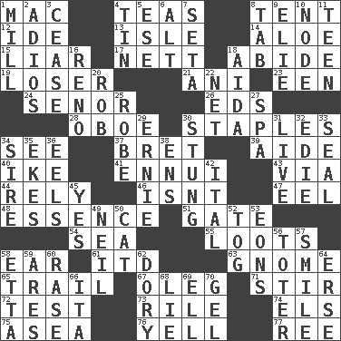 ACROSS 1. Big _ 4. Beverages made from leaves 8. Portable shelter 12. Binary compound 13. Small island 14. Medicinal plant 15. One who doesn't tell the truth 17. Remaining after all deductions 18. Remain 19. Failure 21. Cuckoo 23. Car or cant ending 24. Sir (Sp.) 26. Begley and Asner 28. Mitch Miller's instrument 30. Paper fasteners 34. Perceive with the eye 37. Cy Young winner Saberhagen 39. Assistant 40. Mamie's mate 41. World-weariness 43. By way of 44. Trust 46. Is not 47. Snakelike fish 48. Substance 51. Yard entry 54. Ocean 55. Plunders 58. Ewer handle 61. It would 63. Dwarf 65. Get behind 67. Cassini of fashion 71. Disorderly outburst 72. Trial 73. Cause heat under the collar 74. Raised railways 75. Toward the sea 76. Shout 77. To sift DOWN 1. Place where flour is made 2. Goodbye (Sp.) 3. Stop 4. Metal container 5. Compass dir. 6. Keyboard modifier key 7. Stalk of a moss capsule 8. Keyboard key 9. Writer Wiesel 10. Connecting point 11. Adolescent 16. Former U.S. Attorney General Janet 18. Opera by Verdi 20. Director Reiner 22. Fish or hair follower 25. Loose flowing garment 27. Health resort 29. Bert's buddy 30. Feeling sharp psychological pain 31. Moving, as bait 32. Singer Brickell 33. Lick closed 34. Title for a man of rank and authority 35. Supplements with great effort 36. Snakelike fish 38. Followers of ems 42. Slanted text style (abbr.) 45. It is so 49. Famous astronaut Armstrong 50. Feline 52. Coat; cloak 53. Immeasurably long periods of time 56. Carrier 57. Grin 58. Singer James 59. Ancient Greek god of war 60. Raze (variant) 62. Dinghy 64. Celtic language 66. Call ___ day 68. Falsehood 69. Pipe bend 70. Set